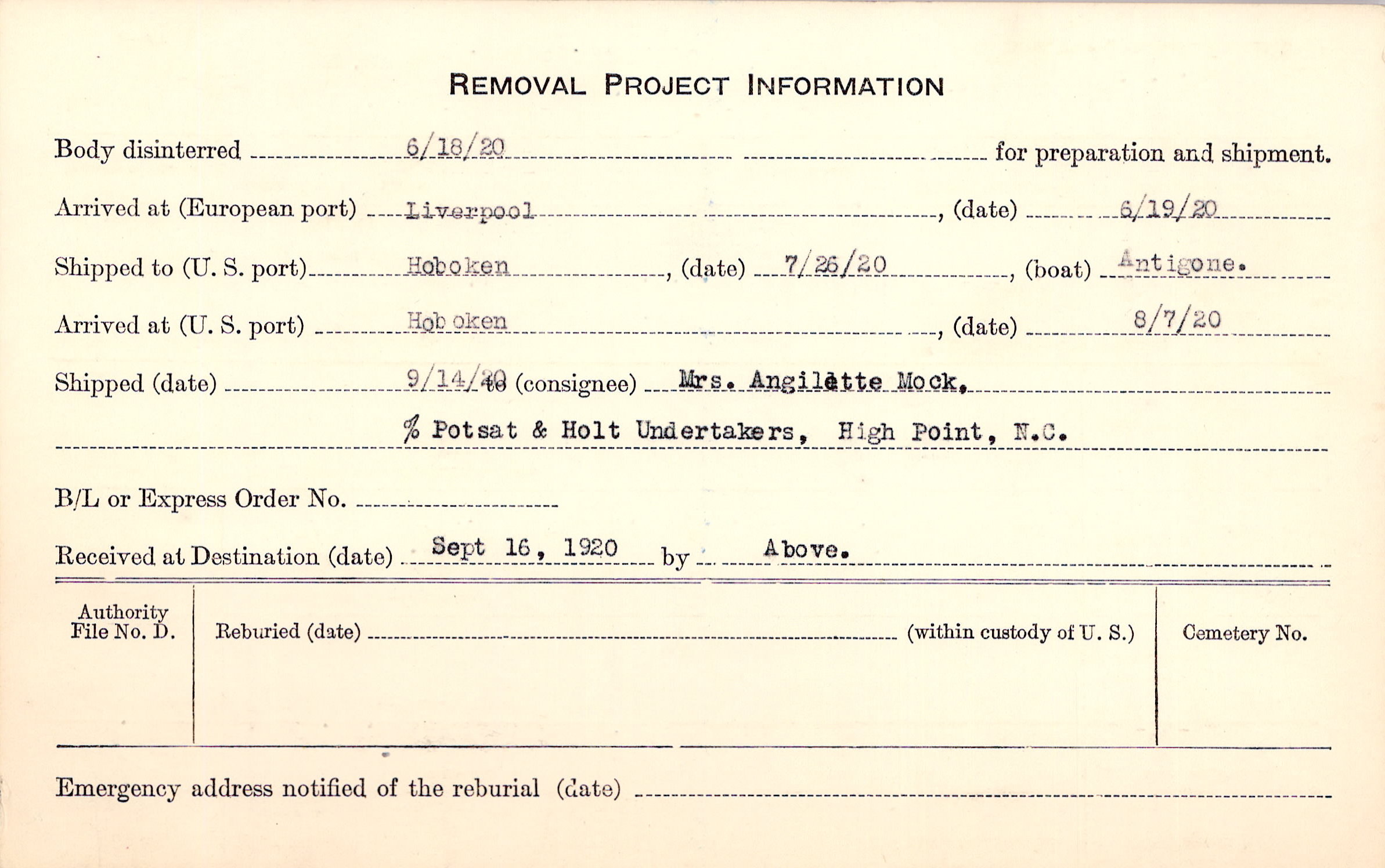 Body disinterred 6/18/1920 for preparation and shipment.
