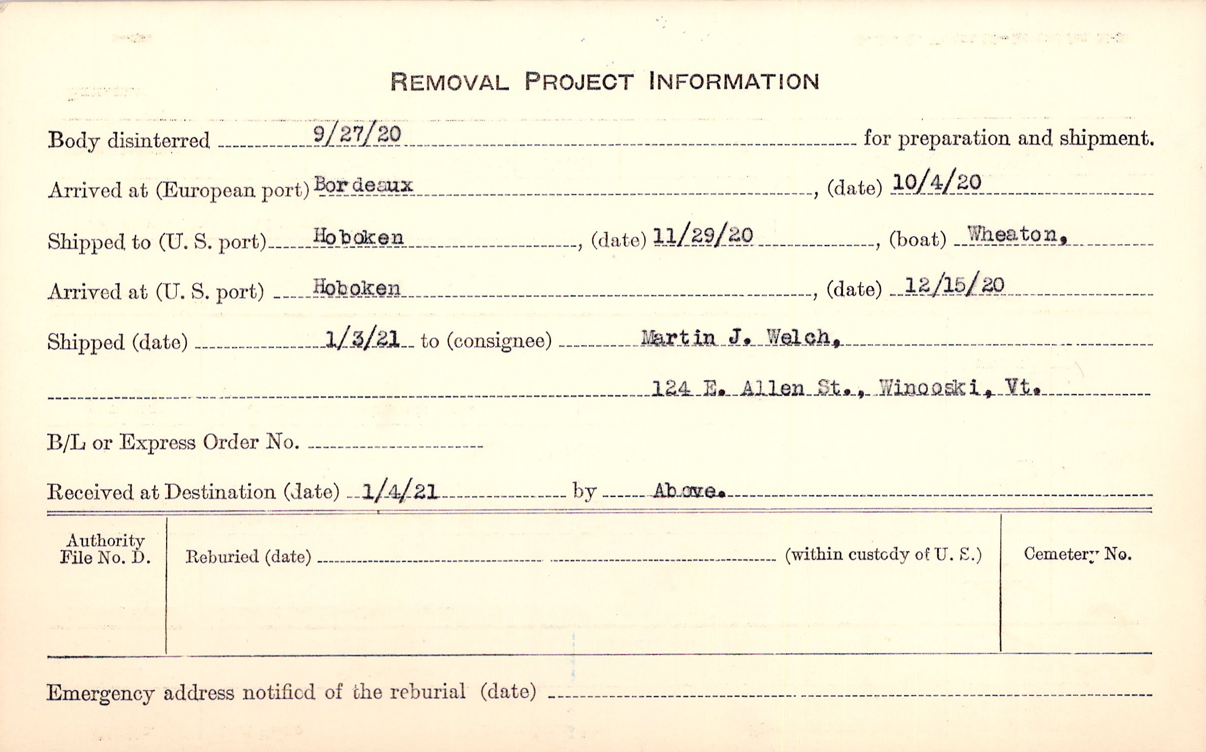 to Martin J. Welch, 124 E. Allen St., Winooski, Vt.