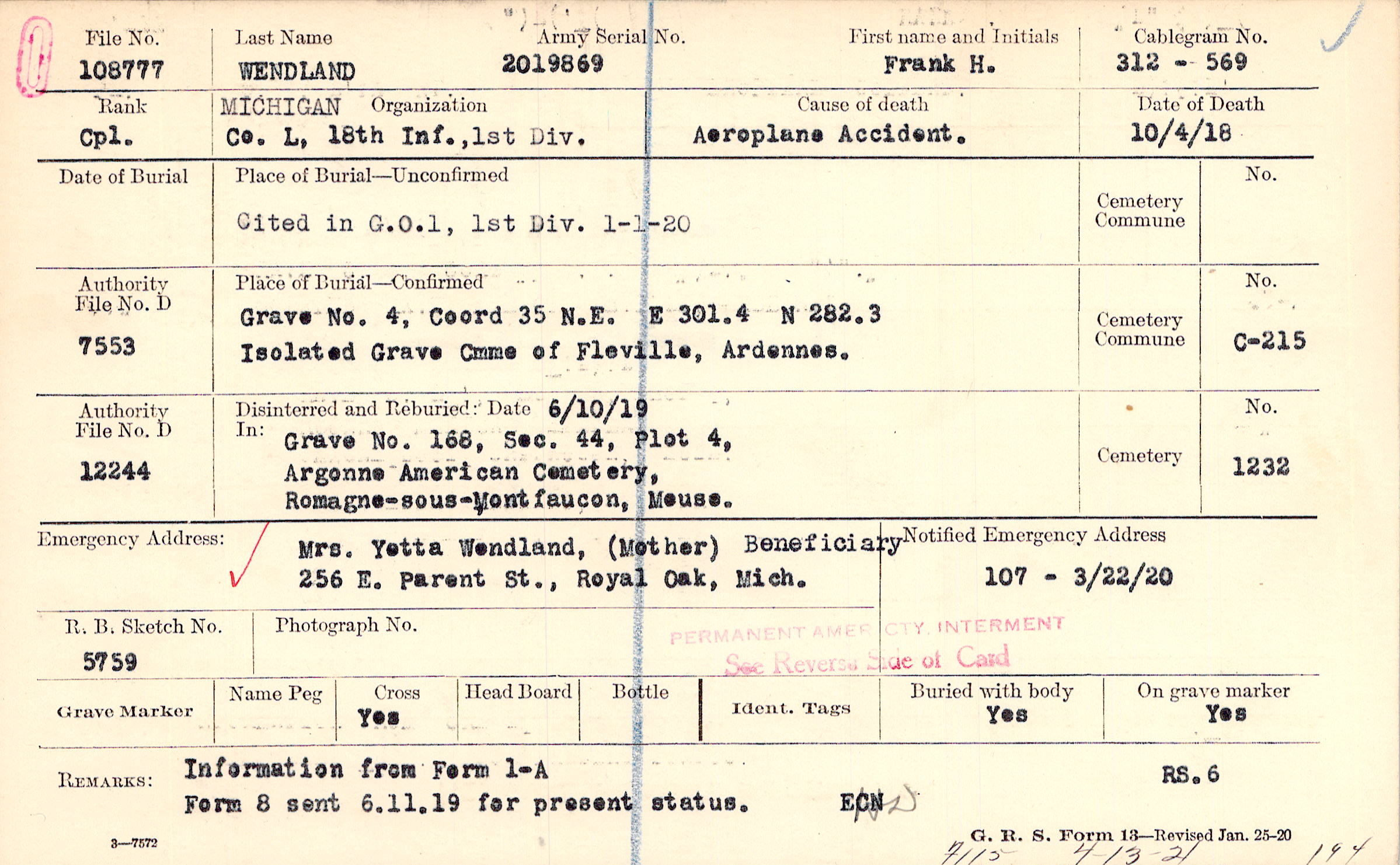 Mrs. Yetta Wendland, (Mother), 256 E. Parent St., Royal Oak, Mich., Beneficiary