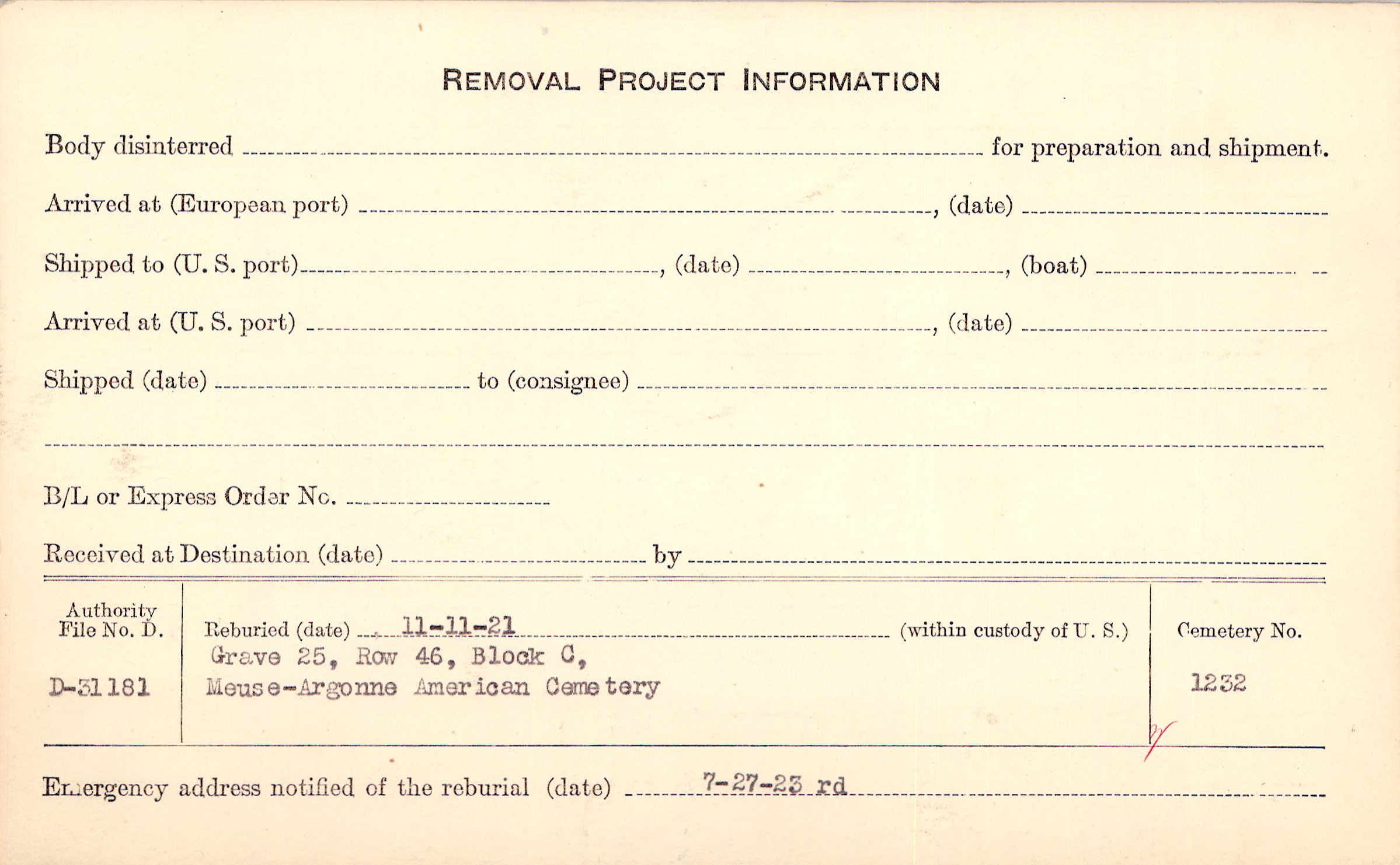 | Permanent Burial in Foreign Cemetery |