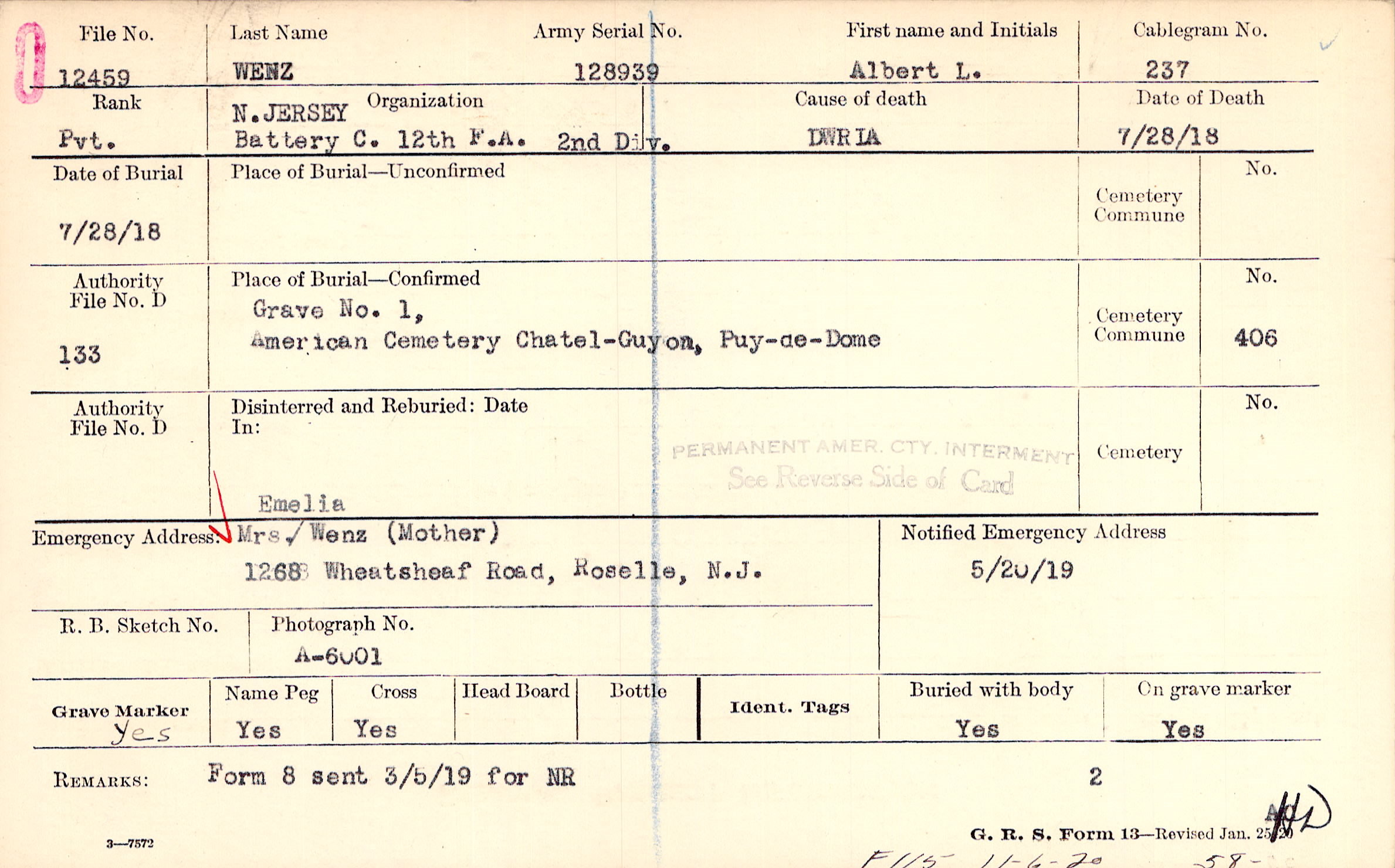 Mrs. Wenz (mother), 1268 Wheatsheaf Road, Roselle, N.J.