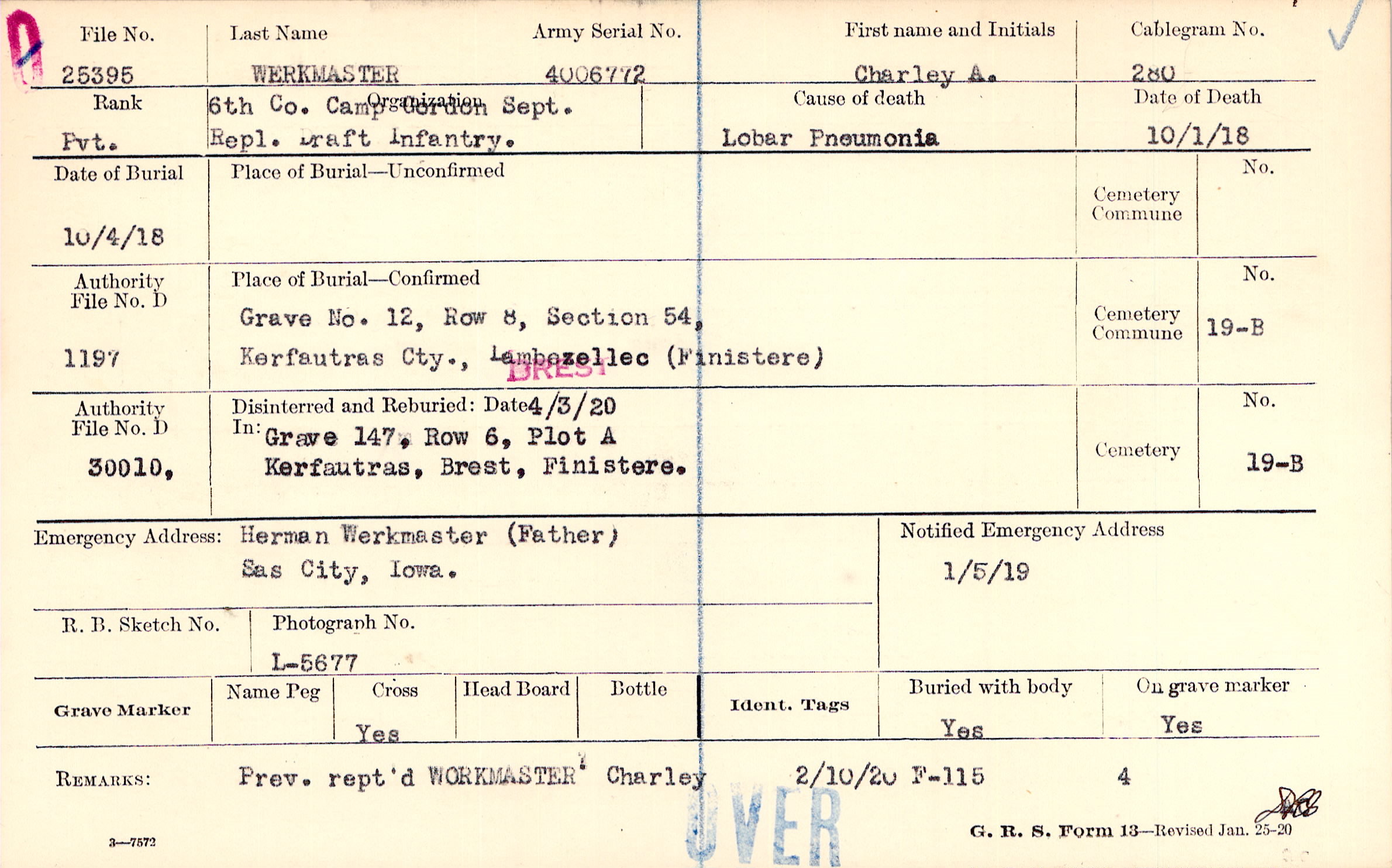 Body disinterred 6/3/1920 for preparation and shipment.