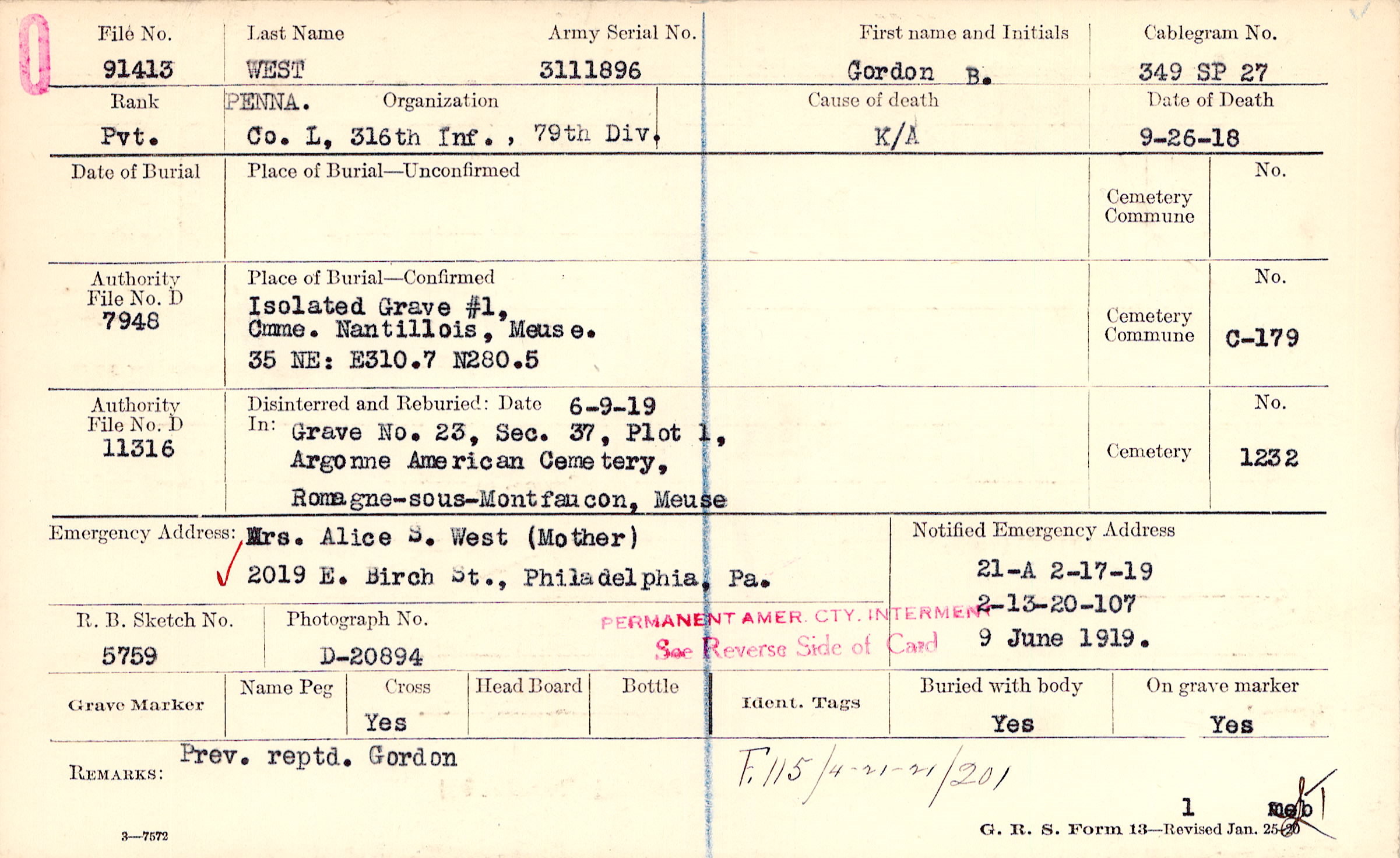 Mrs. Alice S. West (Mother), 2019 E. Birch St., Philadelphia, Pa., 9-Jun-19