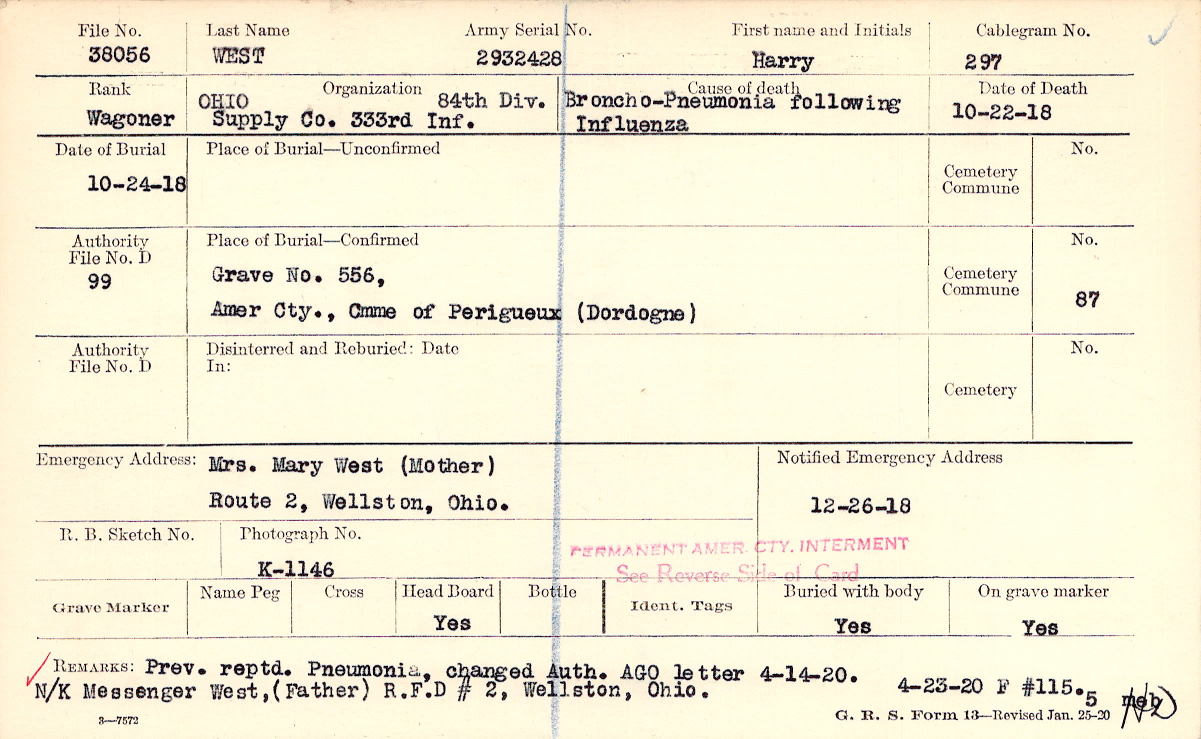 Mrs. Mary West (Mother), Route 2, Wellston, Ohio.