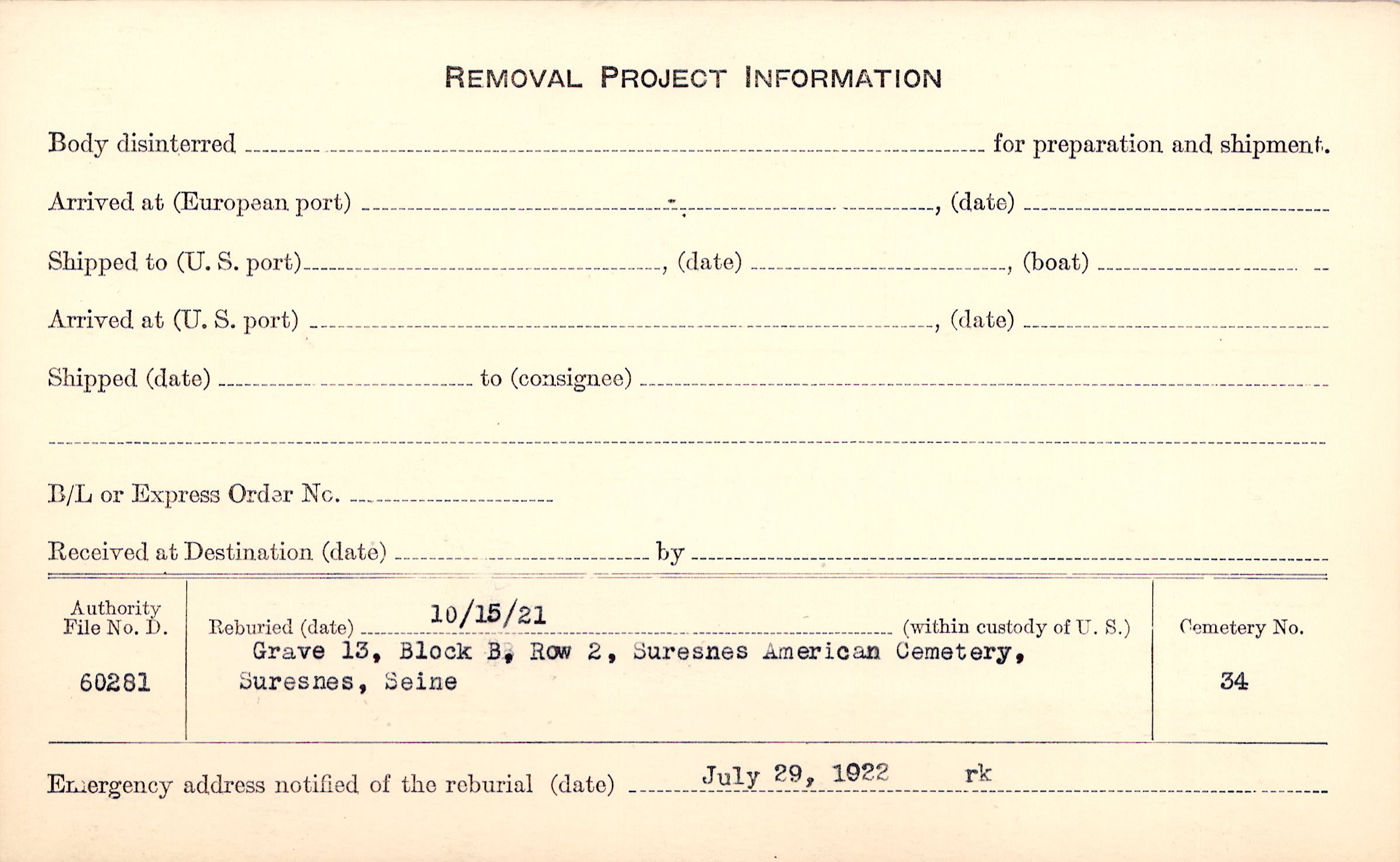 | Permanent Burial in Foreign Cemetery |