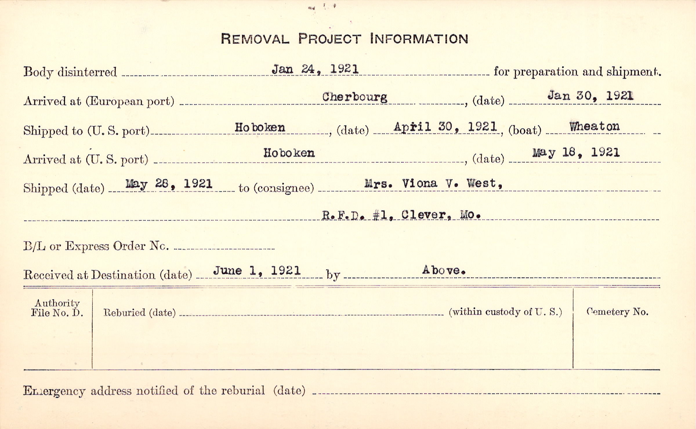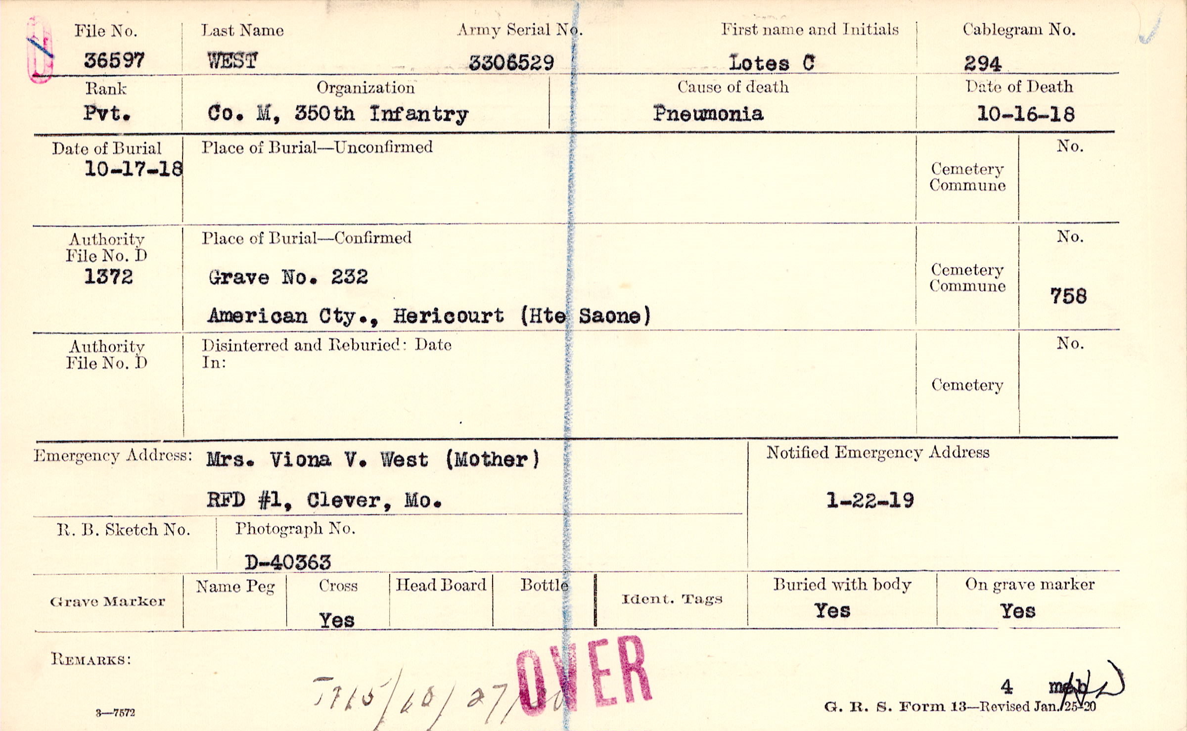 Mrs. Viona V. West (Mother), RFD #1, Clever, Mo.