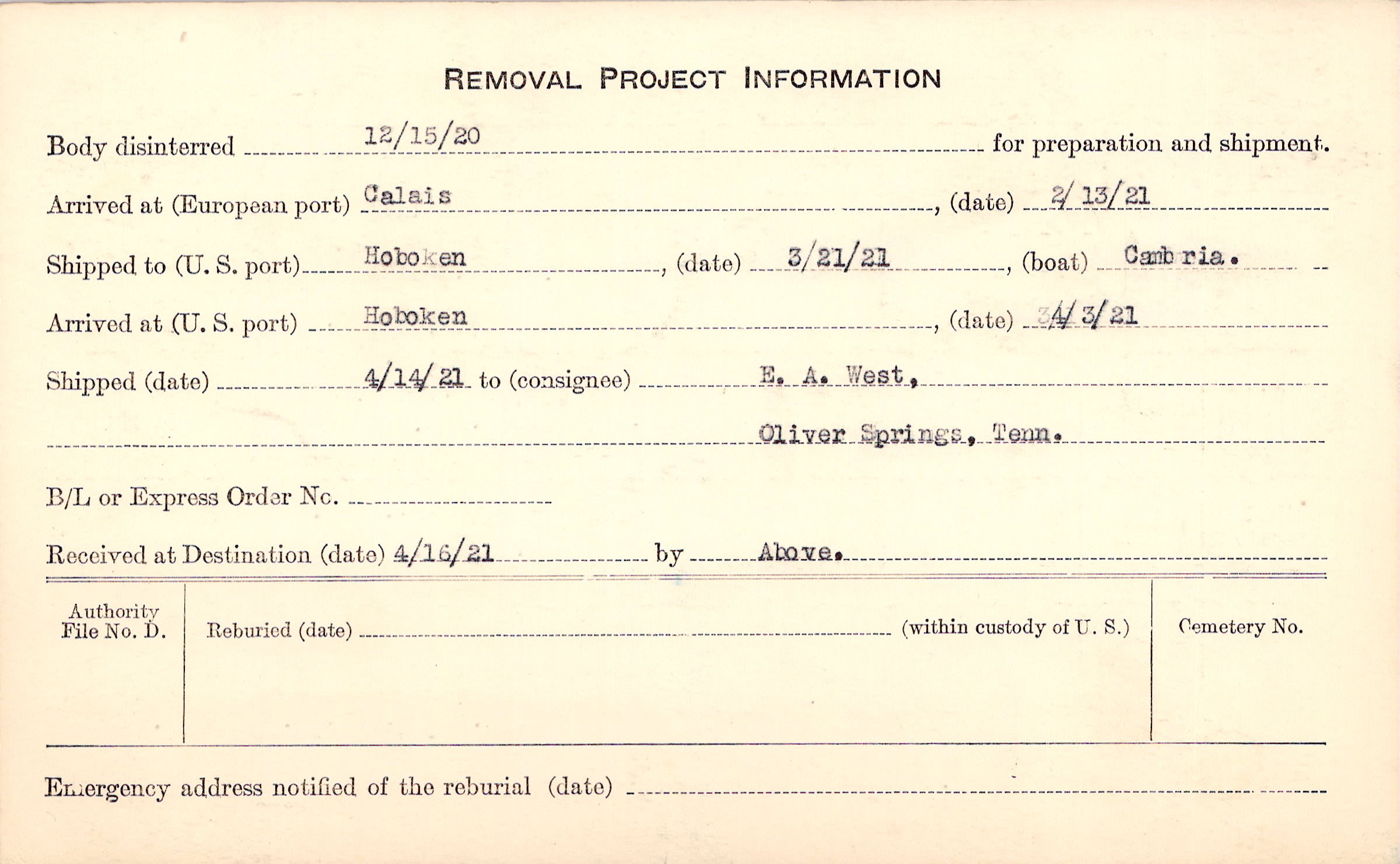 Body disinterred 12/15/1920 for preparation and shipment.