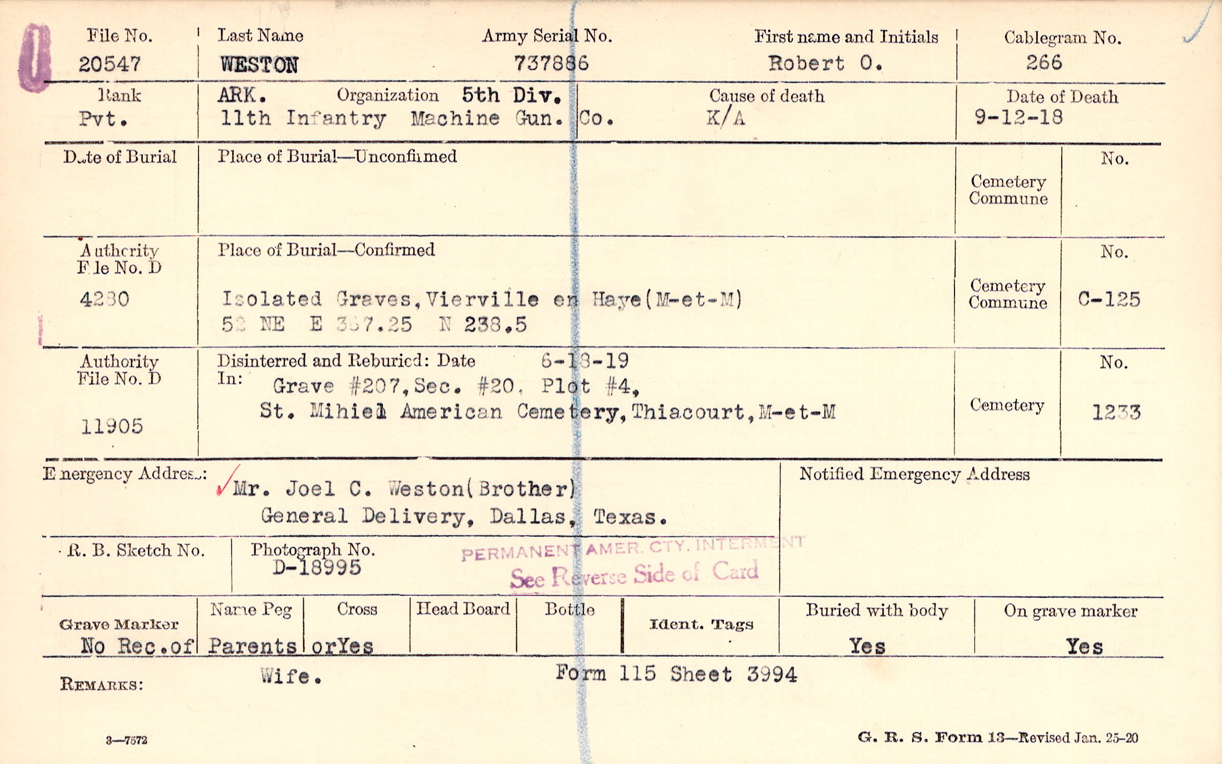 Grave 207, Section 20, Plot 4, St. Mihiel American Cemetery, Thiaucourt, Meurthe-et-Moselle