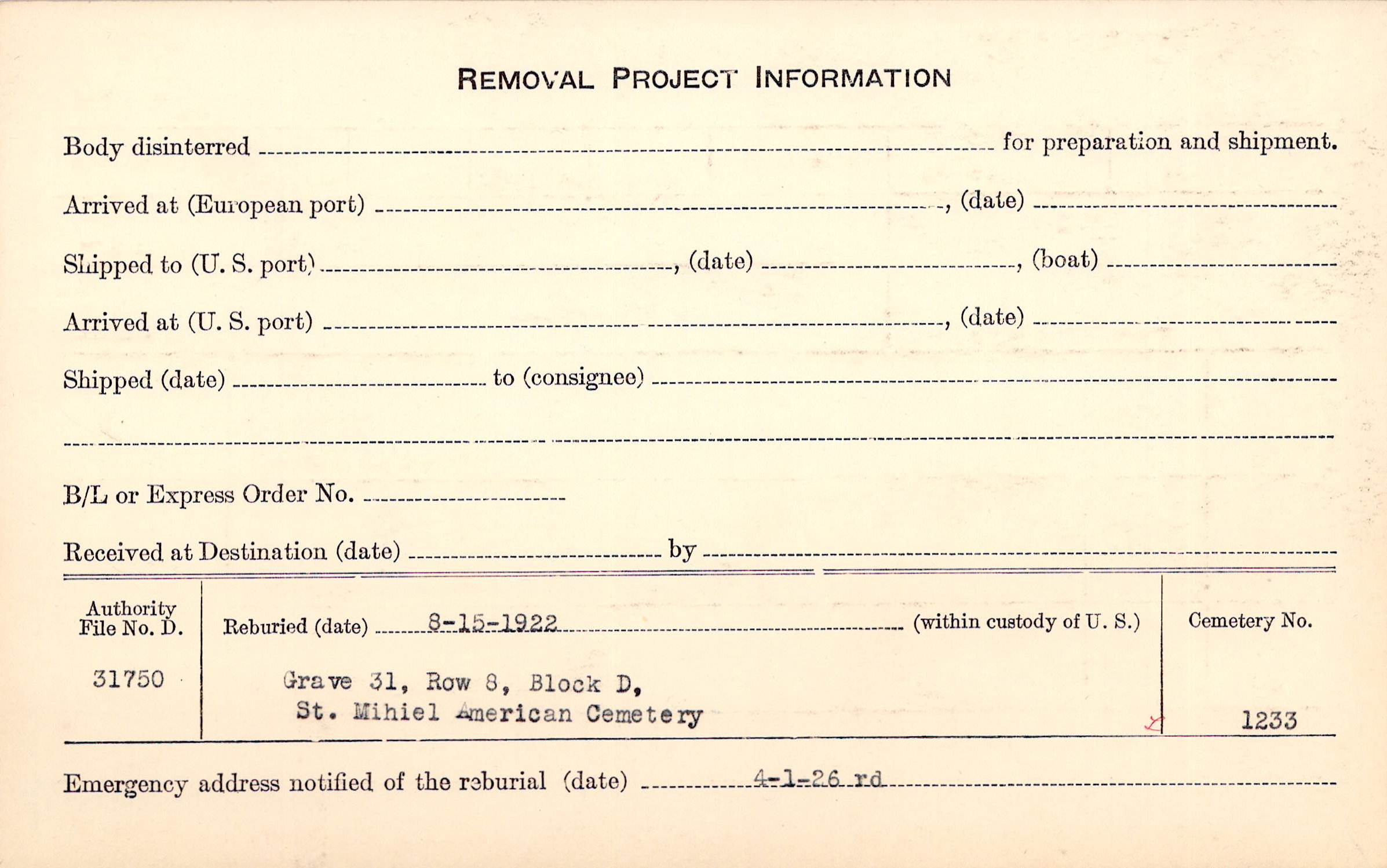 | Permanent Burial in Foreign Cemetery |