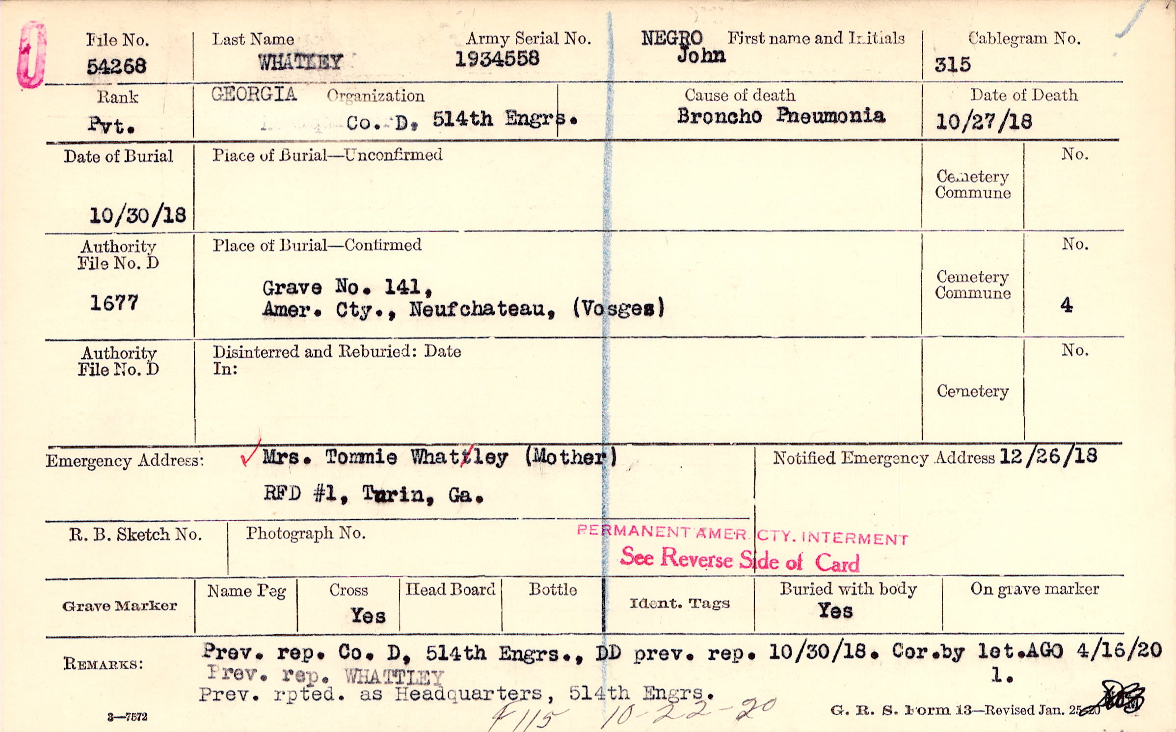 Grave 141, Amer. Cty., Neufchateau, Vosges