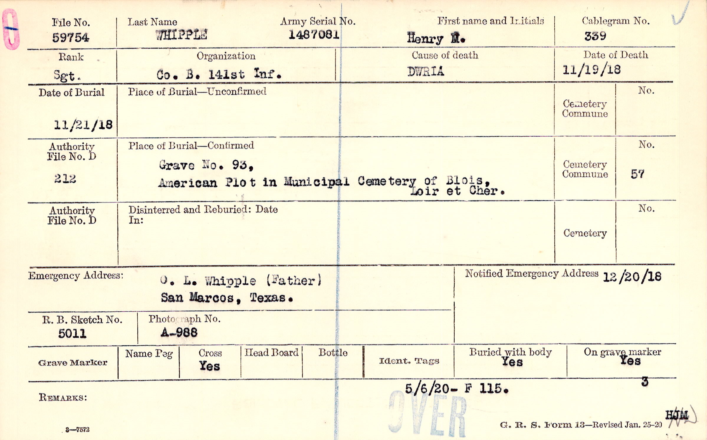 Grave 93, American Plot in Municipal Cemetery of Blois, Loir et Cher.