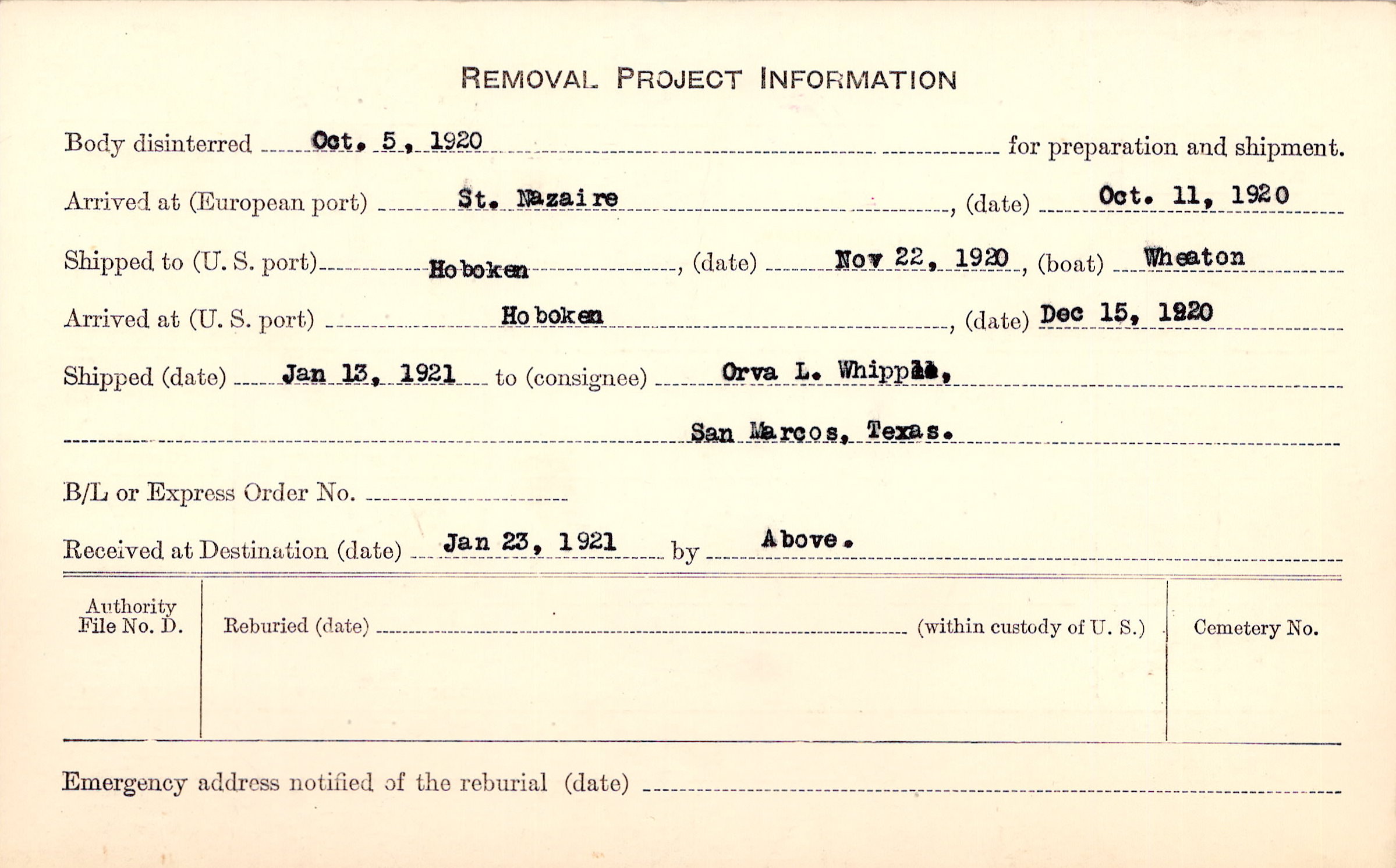 Body disinterred 10/5/1920 for preparation and shipment.