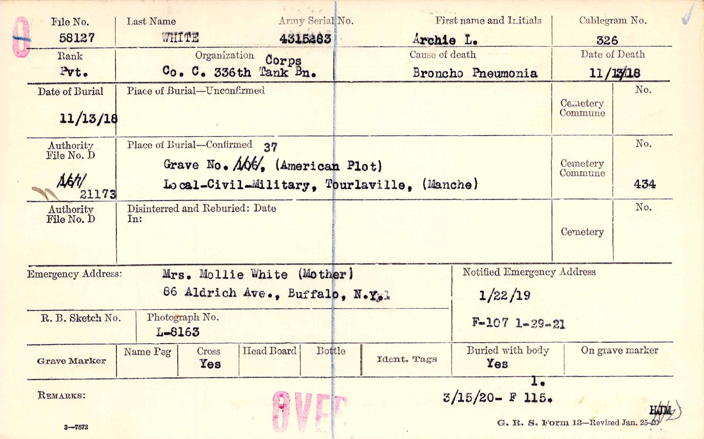 Mrs. Mollie White (Mother), 86 Aldrich Ave., Buffalo, N.Y.