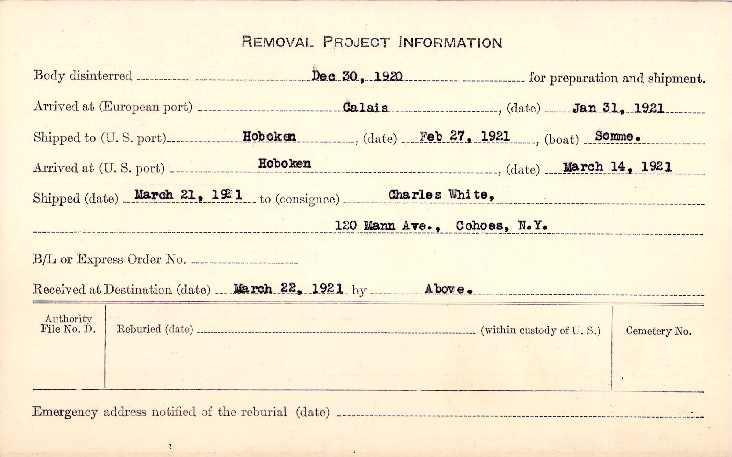 Body disinterred 12/30/1920 for preparation and shipment.