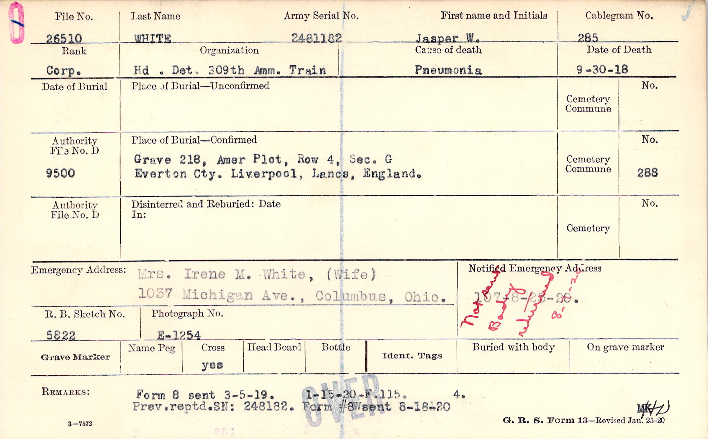 Grave 218, Amer Plot, Row 4, Sec. G, Everton Cty., Liverpool, Lancs, England.