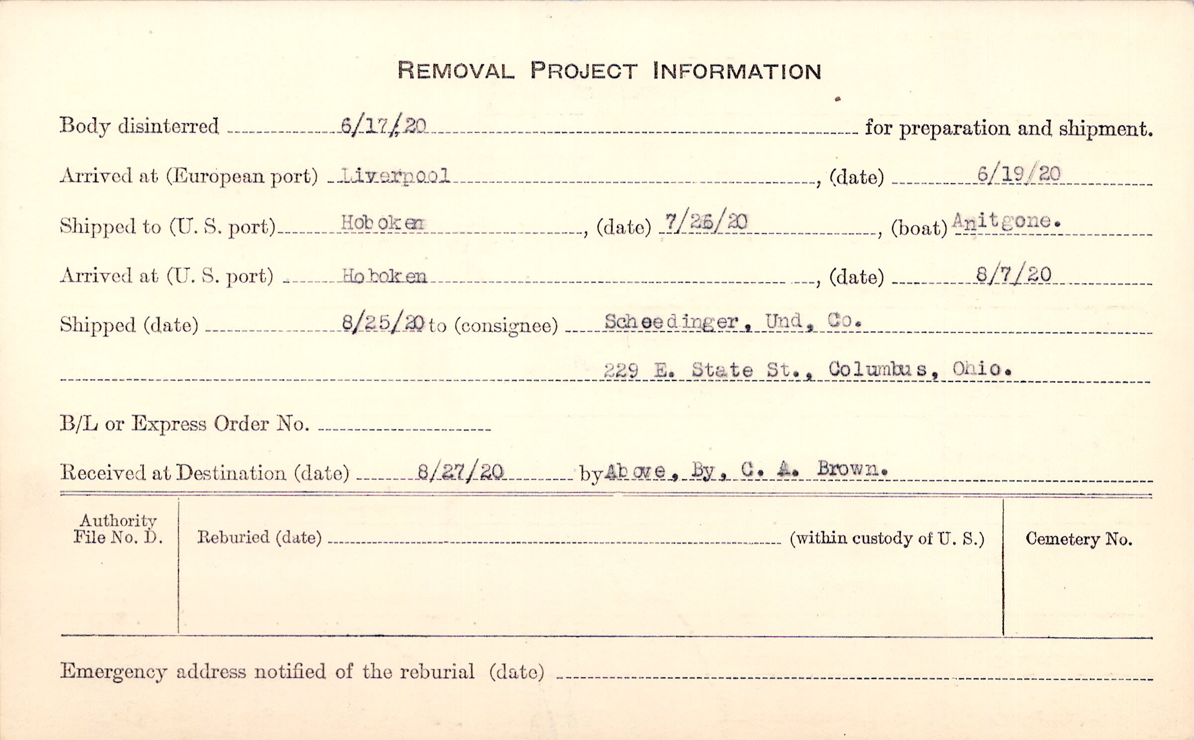 Body disinterred 6/17/1920 for preparation and shipment.