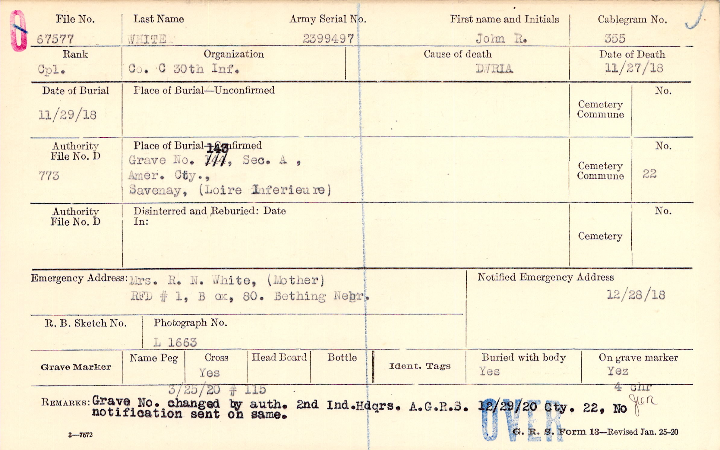 Mrs. R. N. White, (Mother), RFD # 1, B ox, 80. Bething Nebr.