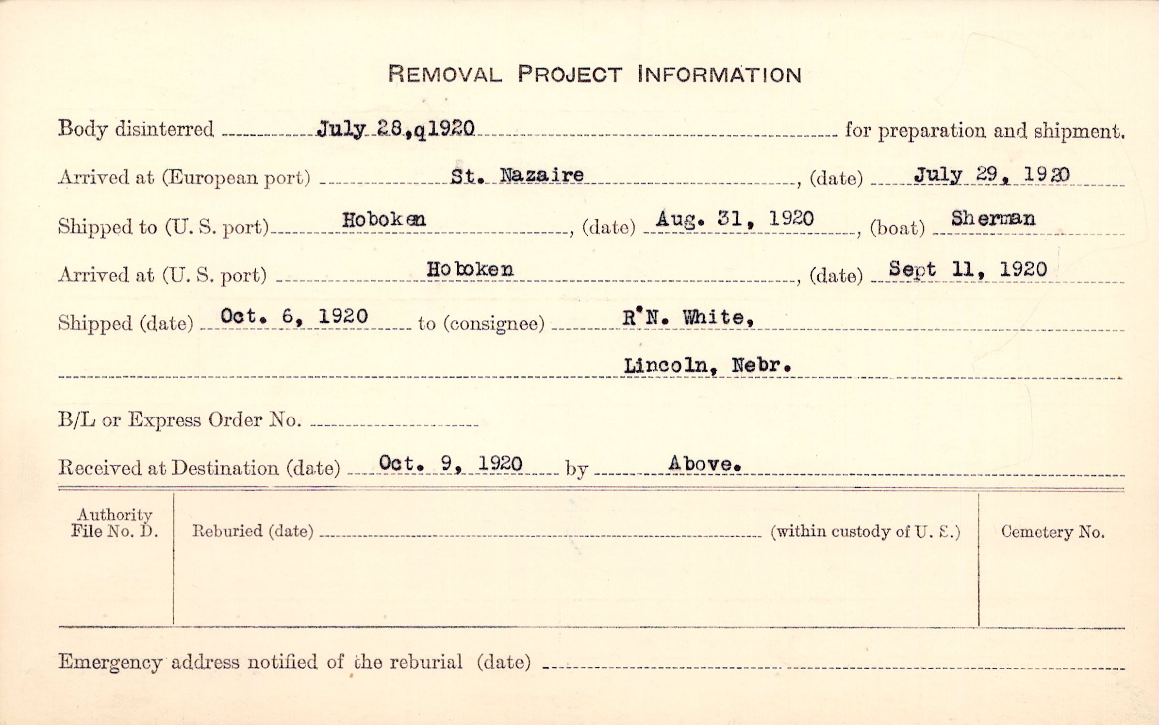 Body disinterred 7/28/1920 for preparation and shipment.