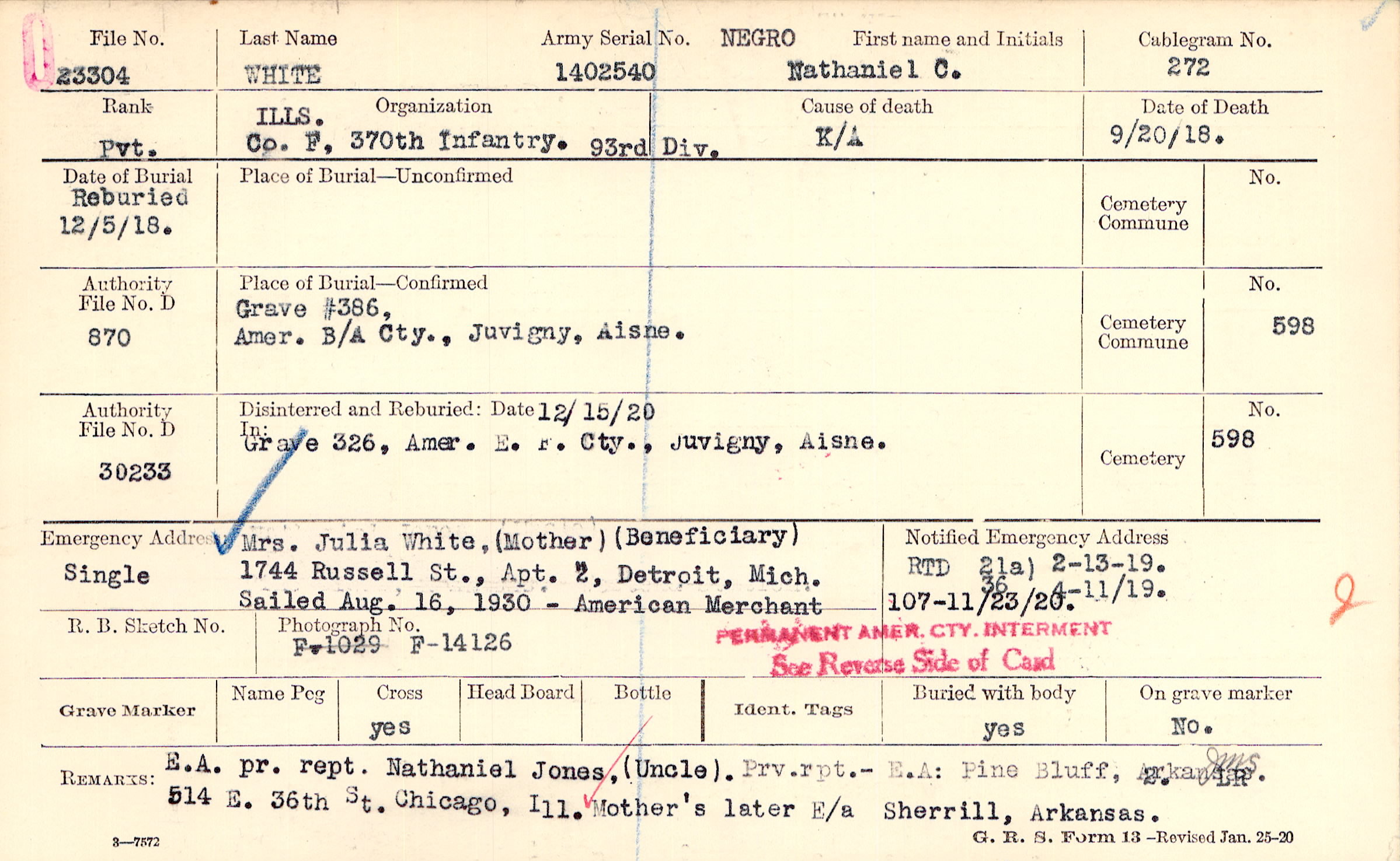 E.A. pr. rept. Nathaniel Jones, (Uncle). 514 E. 36th St. Chicago, Ill. Mother's later E/a Sherrill, Arkansas. Prv. rpt,- A.E: Pine Bluff, Arkansas.