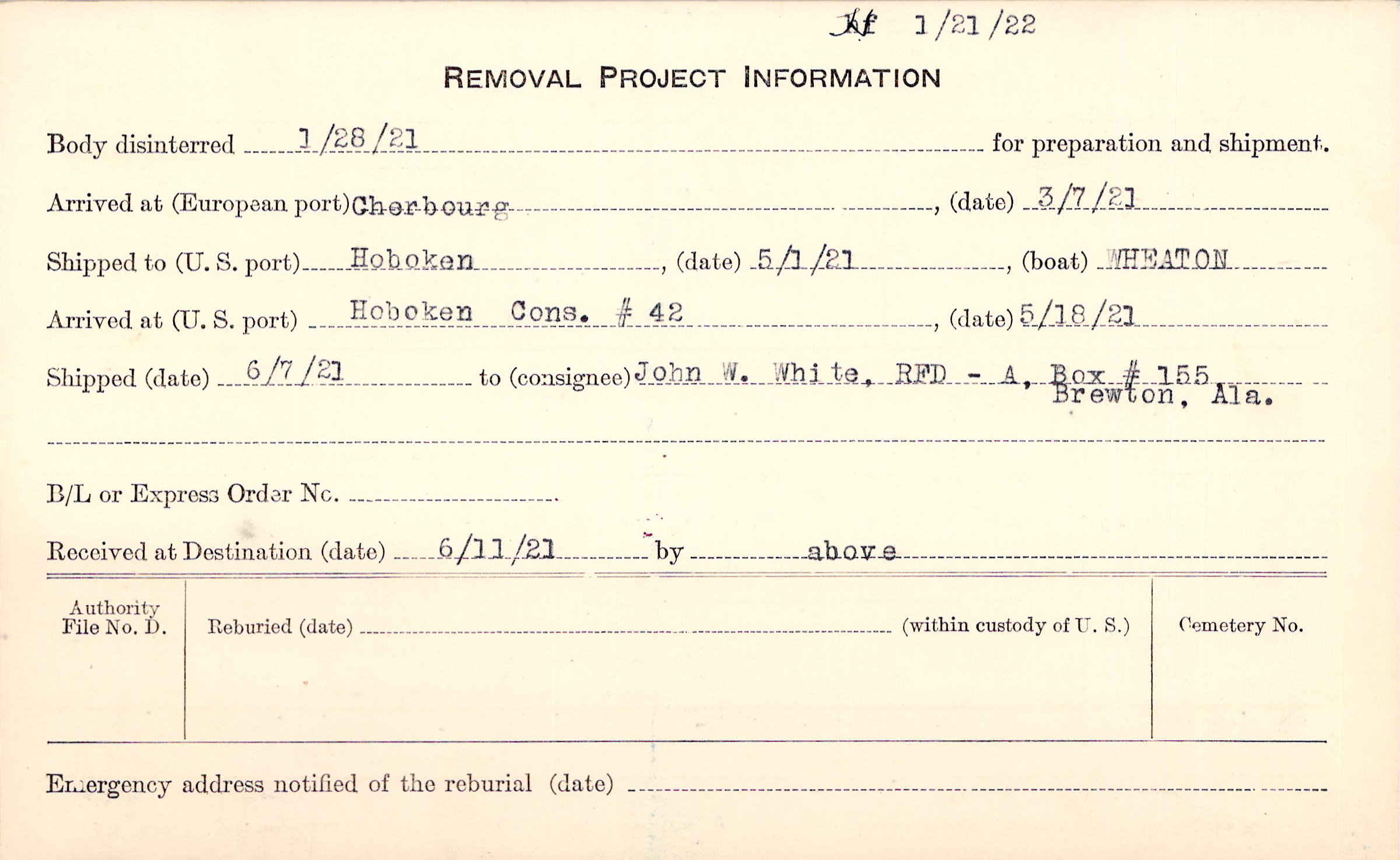 Body disinterred 1/28/1921 for preparation and shipment.