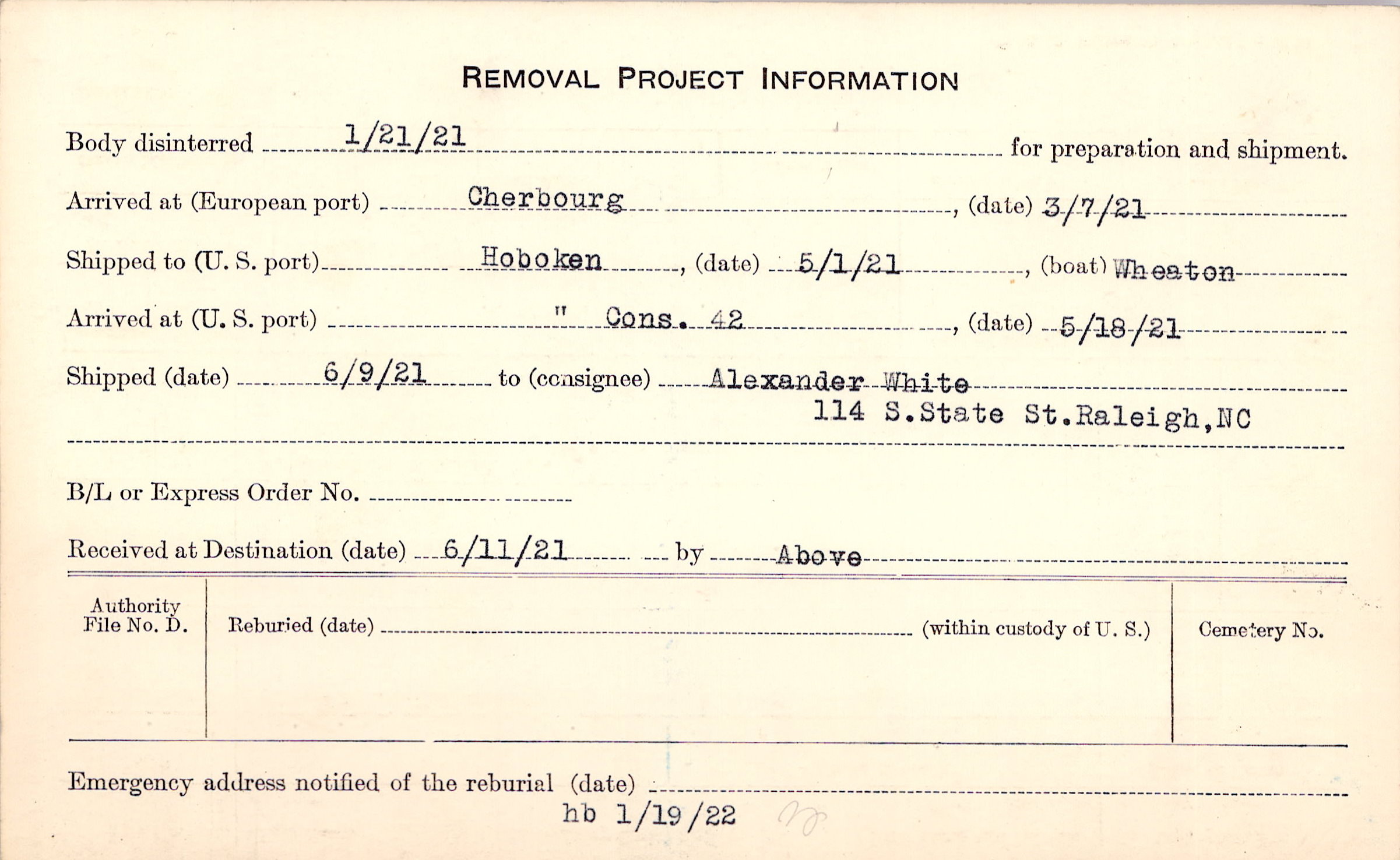 Body disinterred 1/21/1921 for preparation and shipment.