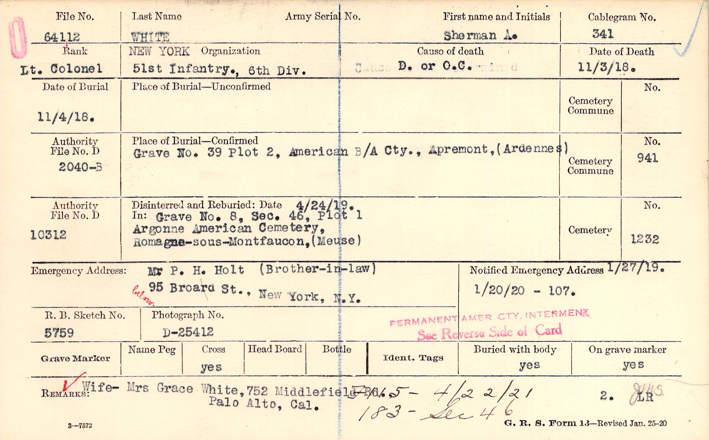 Wife- Mrs Grace White, 752 Middlefield Rd., Palo Alto, Cal., F115 - 4/22/21 183 - Sec 46