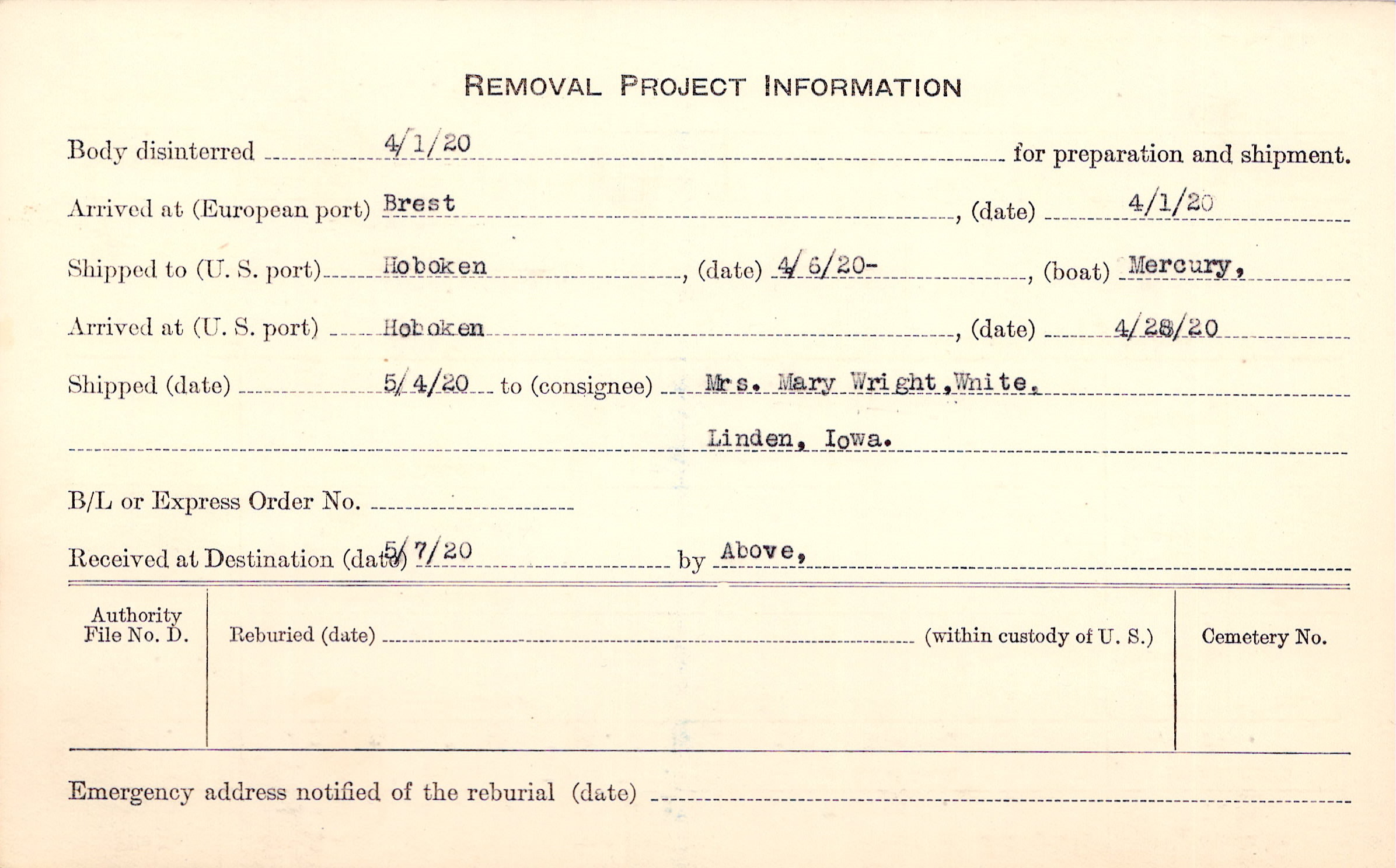 Body disinterred 4/1/1920 for preparation and shipment.