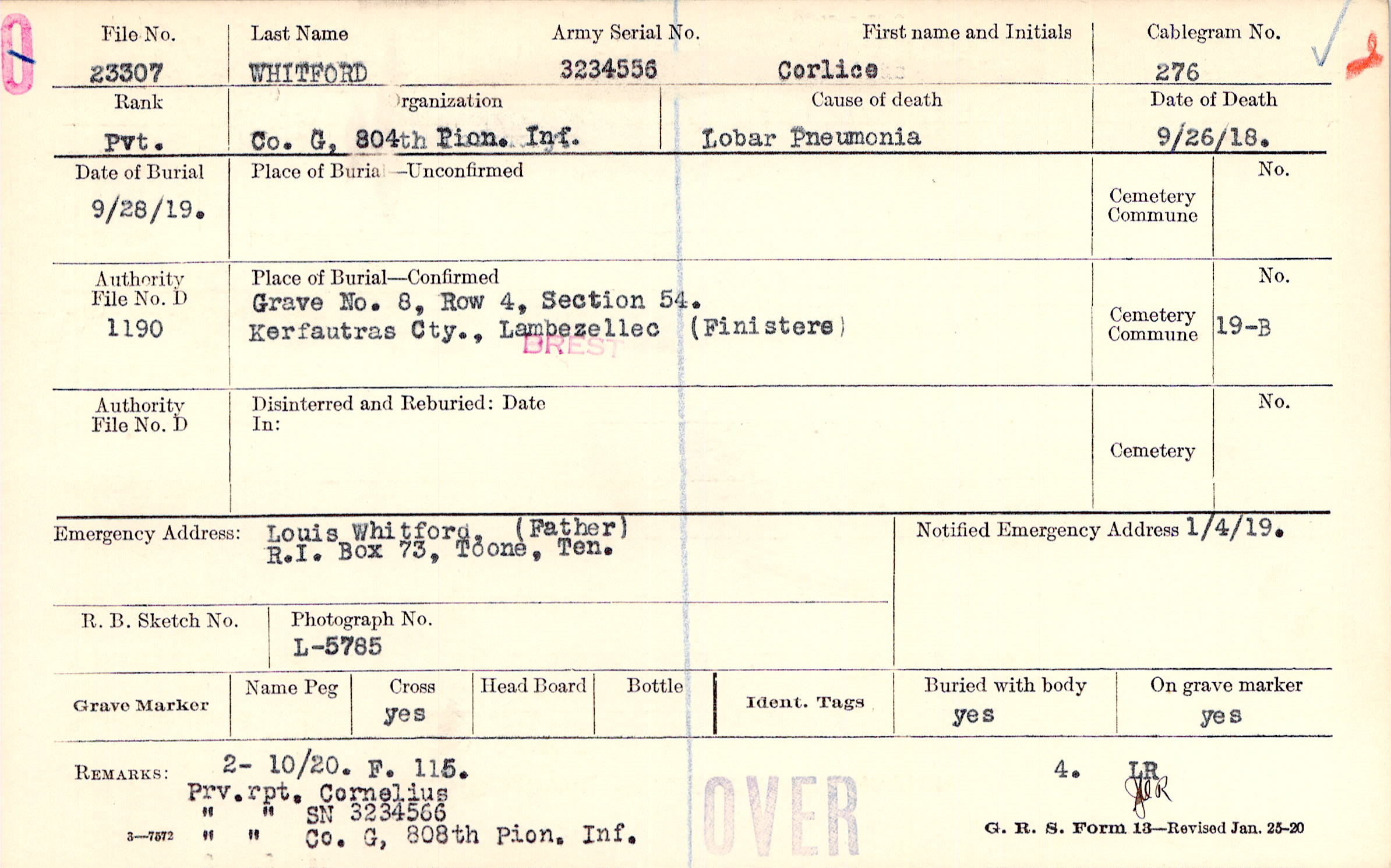 Louis Whitford, (Father), R.I. Box 73, Toone, Ten.