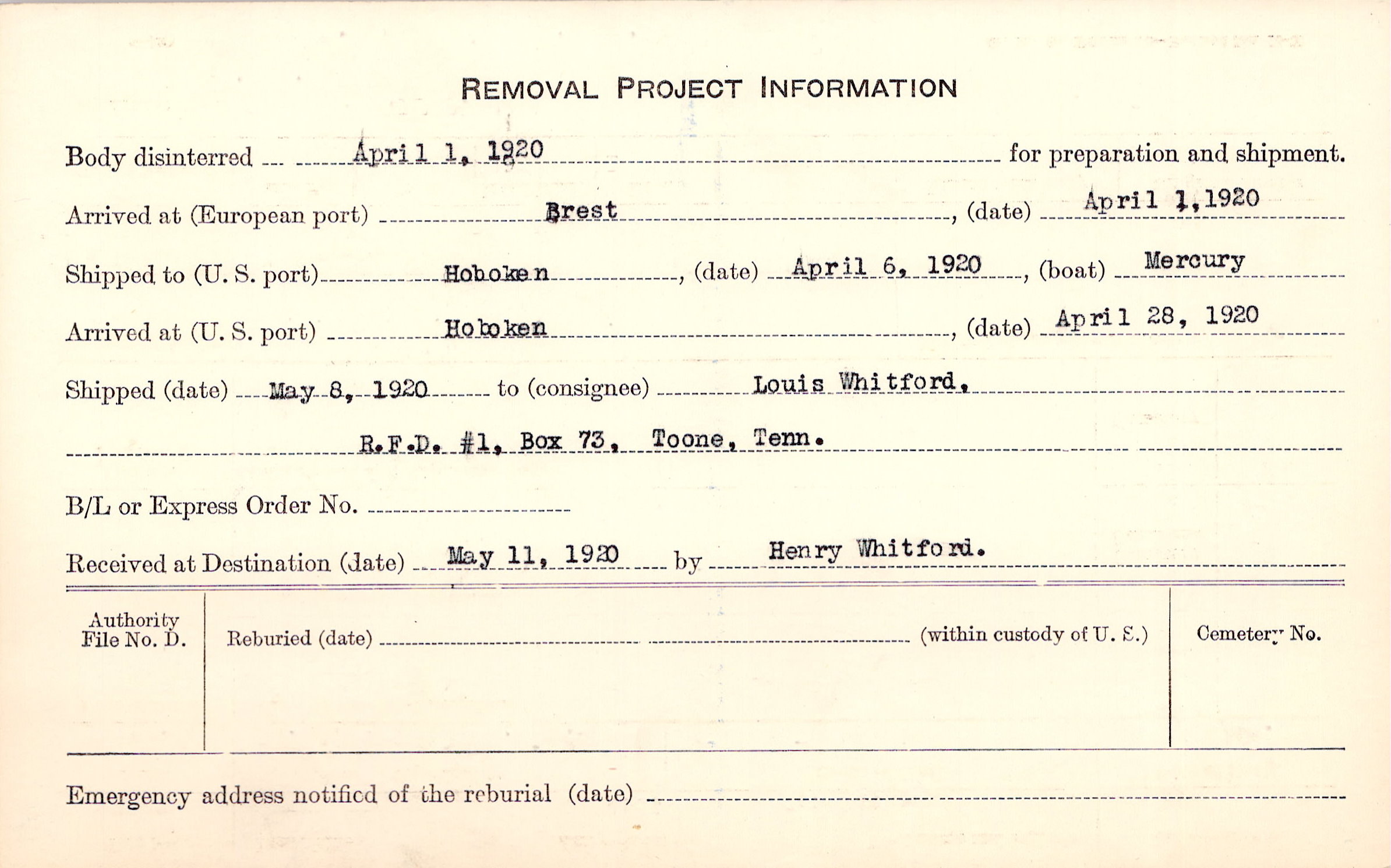 to Louis Whitford, R.F.D, #1, Box 73, Toone, Tenn.