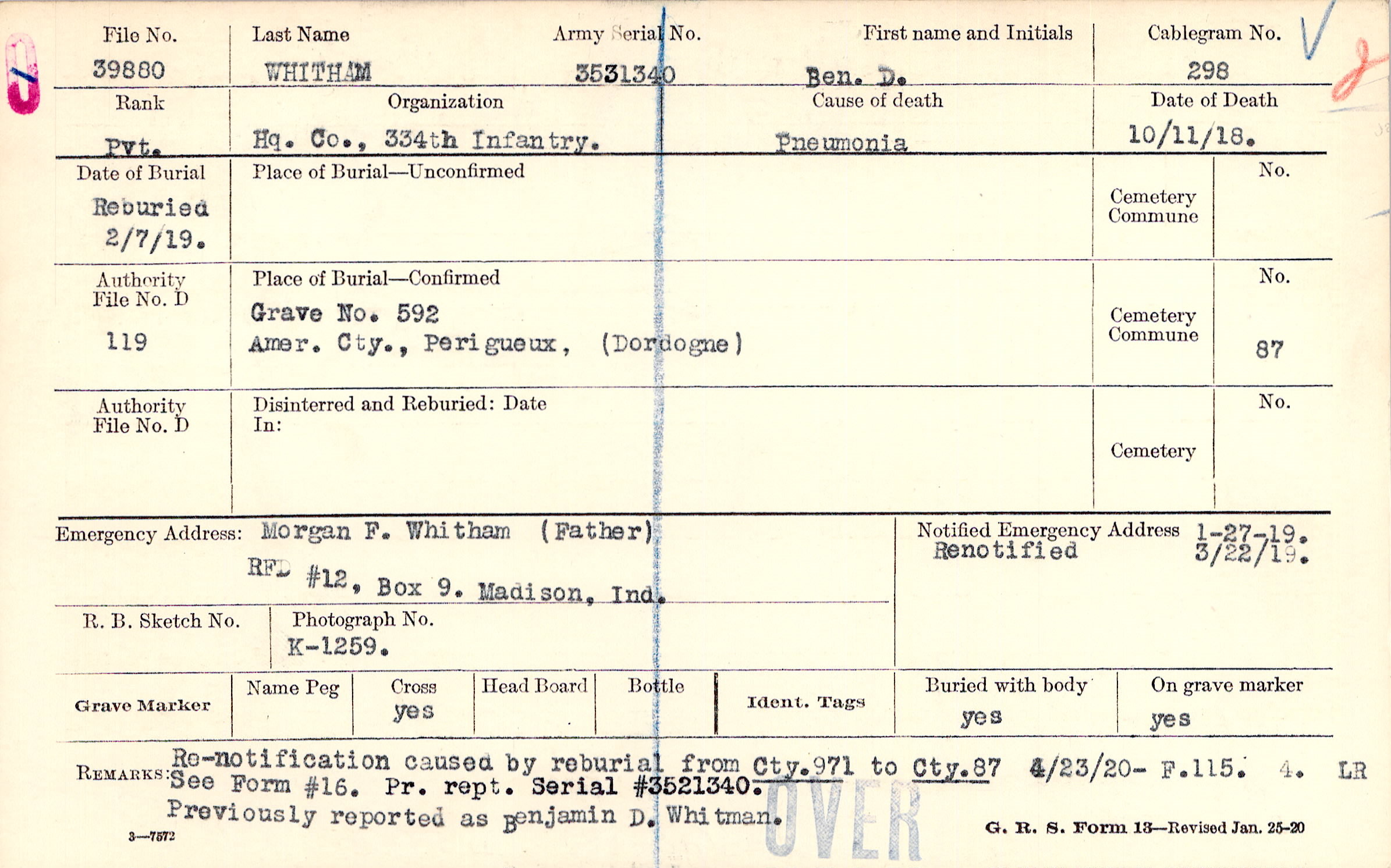 Re-notification caused by reburial from Cty.971 to Cty.87, See form #16. Pr. rept. Serial #3521340 Previously reported as Benjamin D. Whitman., 4/23/20- F.115.