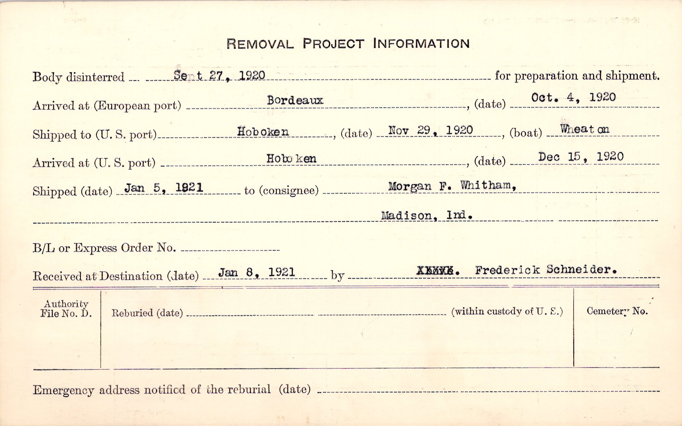 Morgan F. Whitham (Father), RFD #12, Box 9. Madison, Ind.