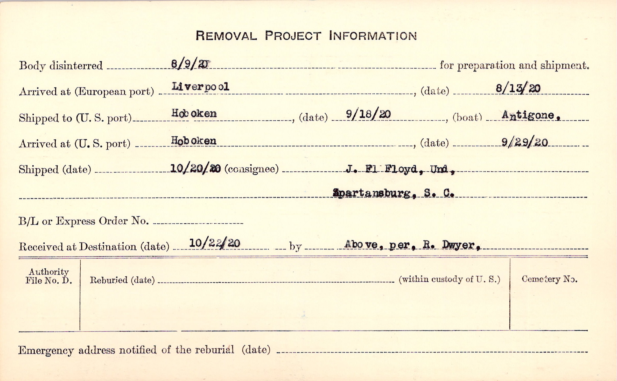 to J. Fl Floyd, Und, Spartansburg, S. C.