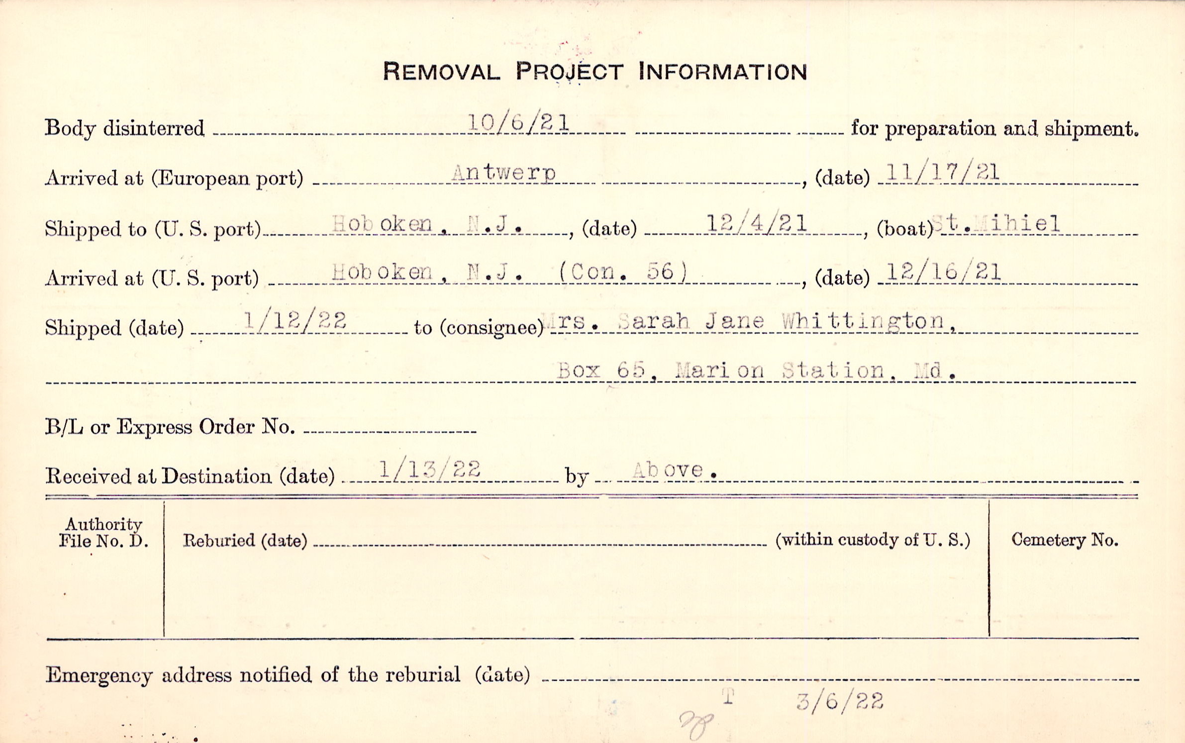 Mrs. Sarah Jane Whittington, (mother), P.O. Box 65, Marion Station, Md.