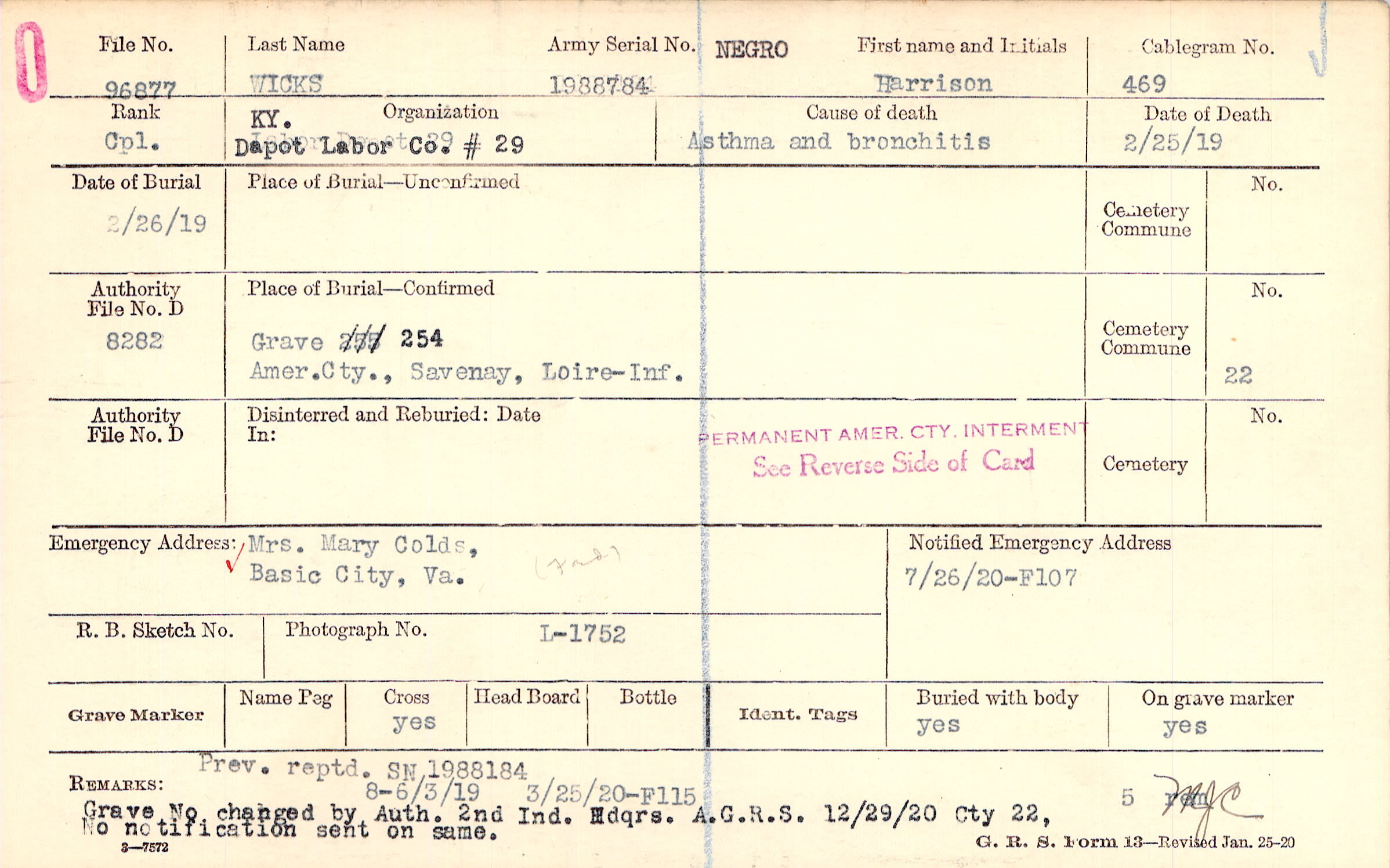 Prev. reptd. SN 1988184 Grave No changed by Auth. 2nd Ind. Hdqrs. A.G.R.S. 12/29/20 Cty 22, No notification sent on same., 8-6/3/19, 3/25/20-F115