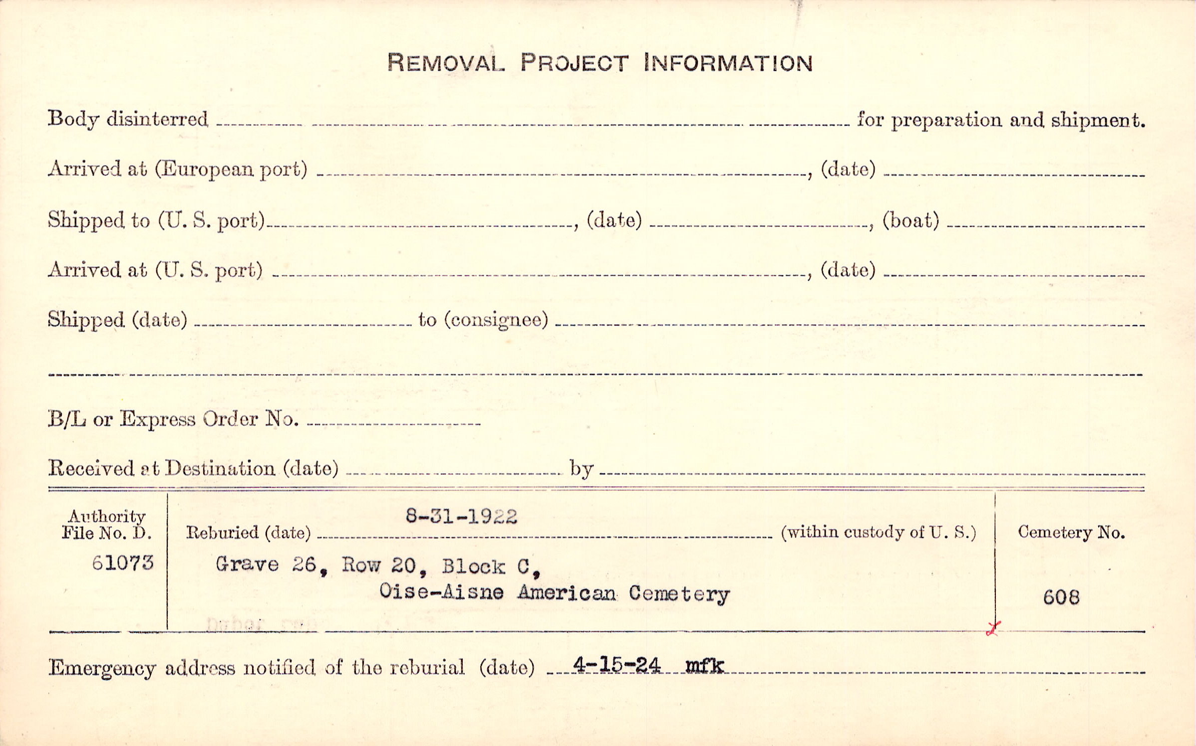 | Permanent Burial in Foreign Cemetery |