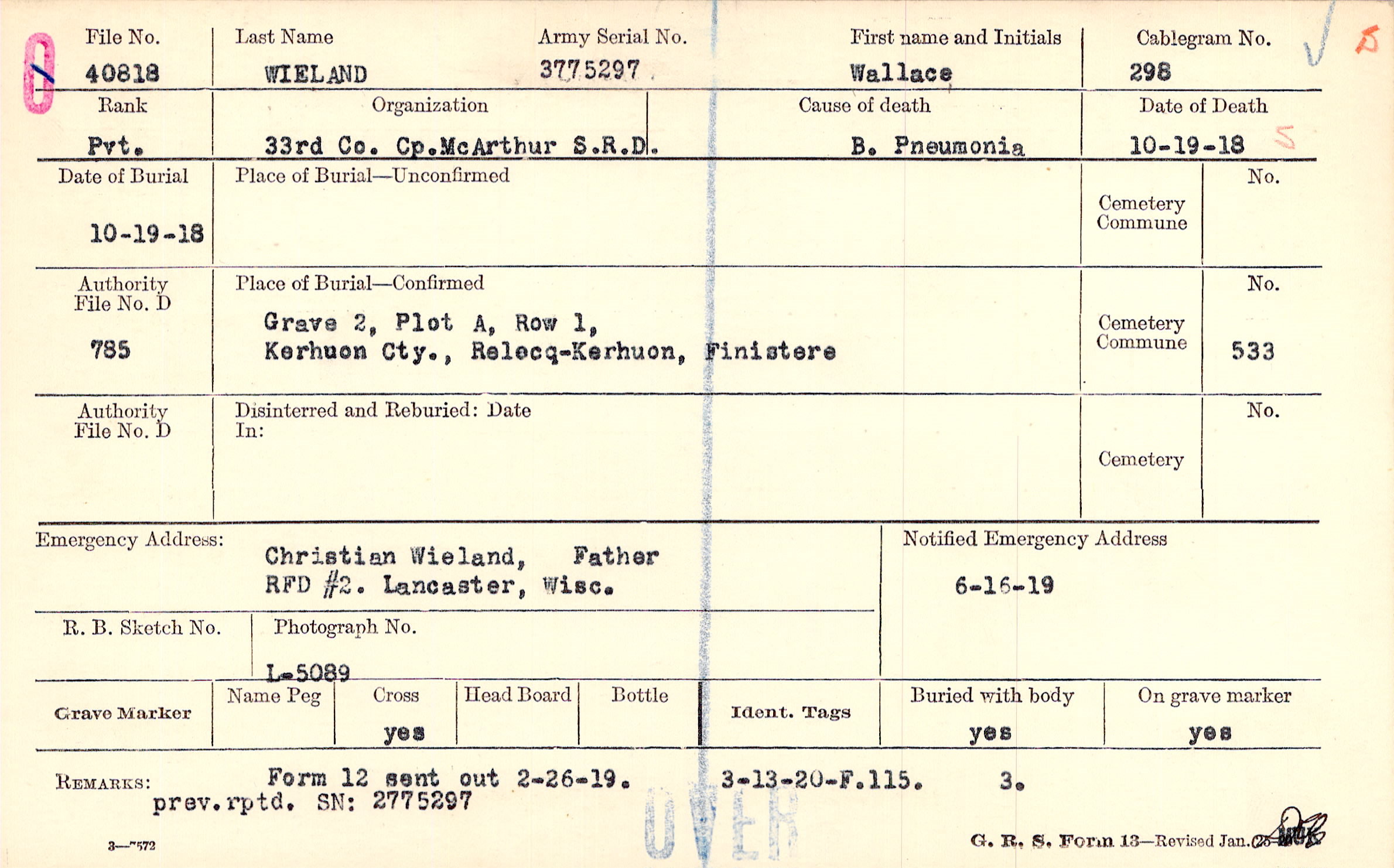 prev.rptd. SN: 2775297, Form 12 sent out 2-26-19. prev.rptd. SN: 2775297, 3-13-20 - F.115.