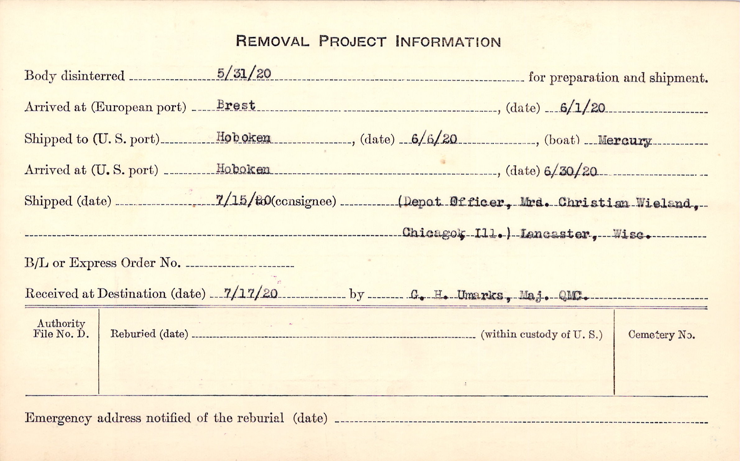 Body disinterred 5/31/1920 for preparation and shipment.