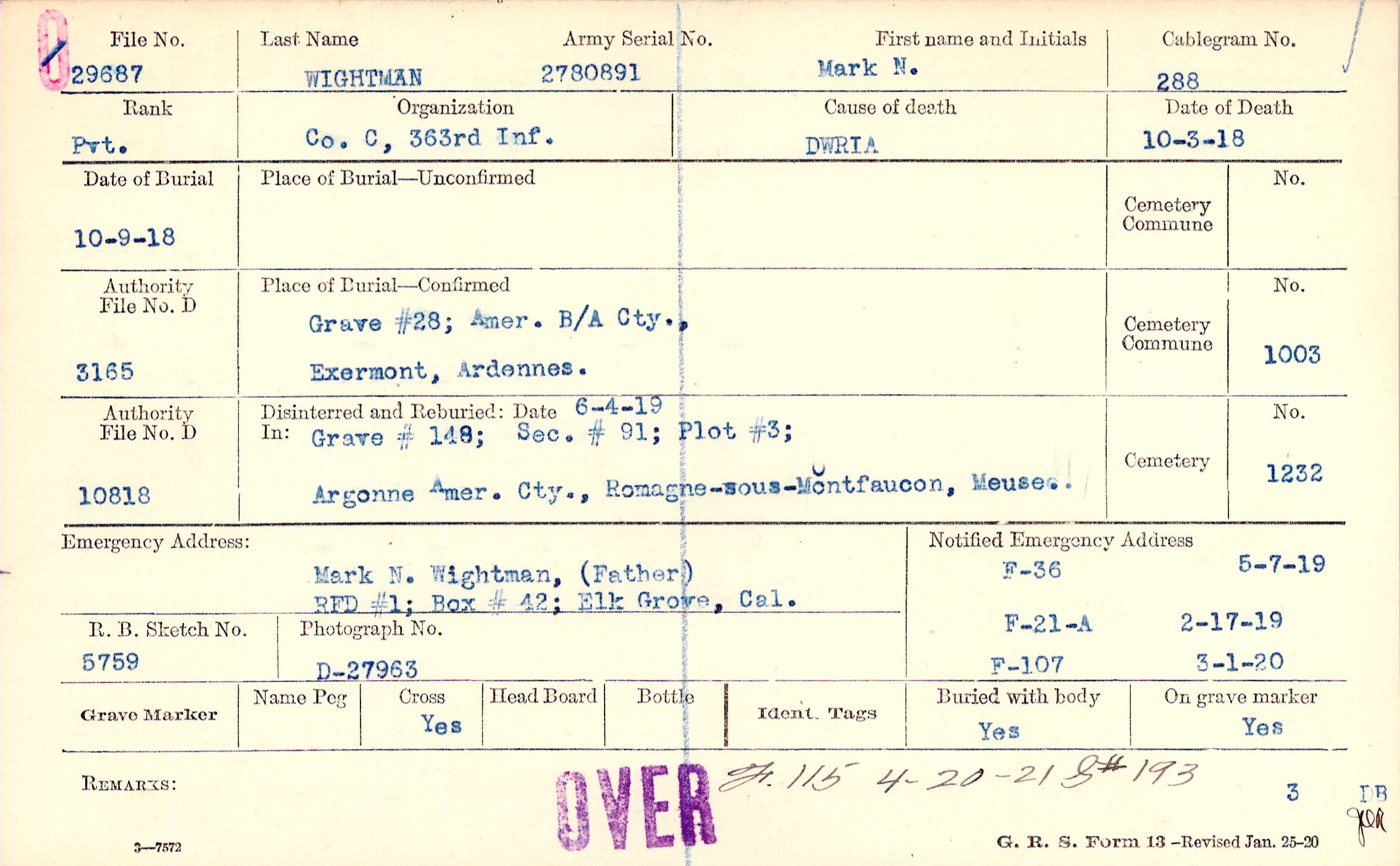Mark N. Wightman (Father), RFD #1, Box # 42, Elk Grove, Cal.