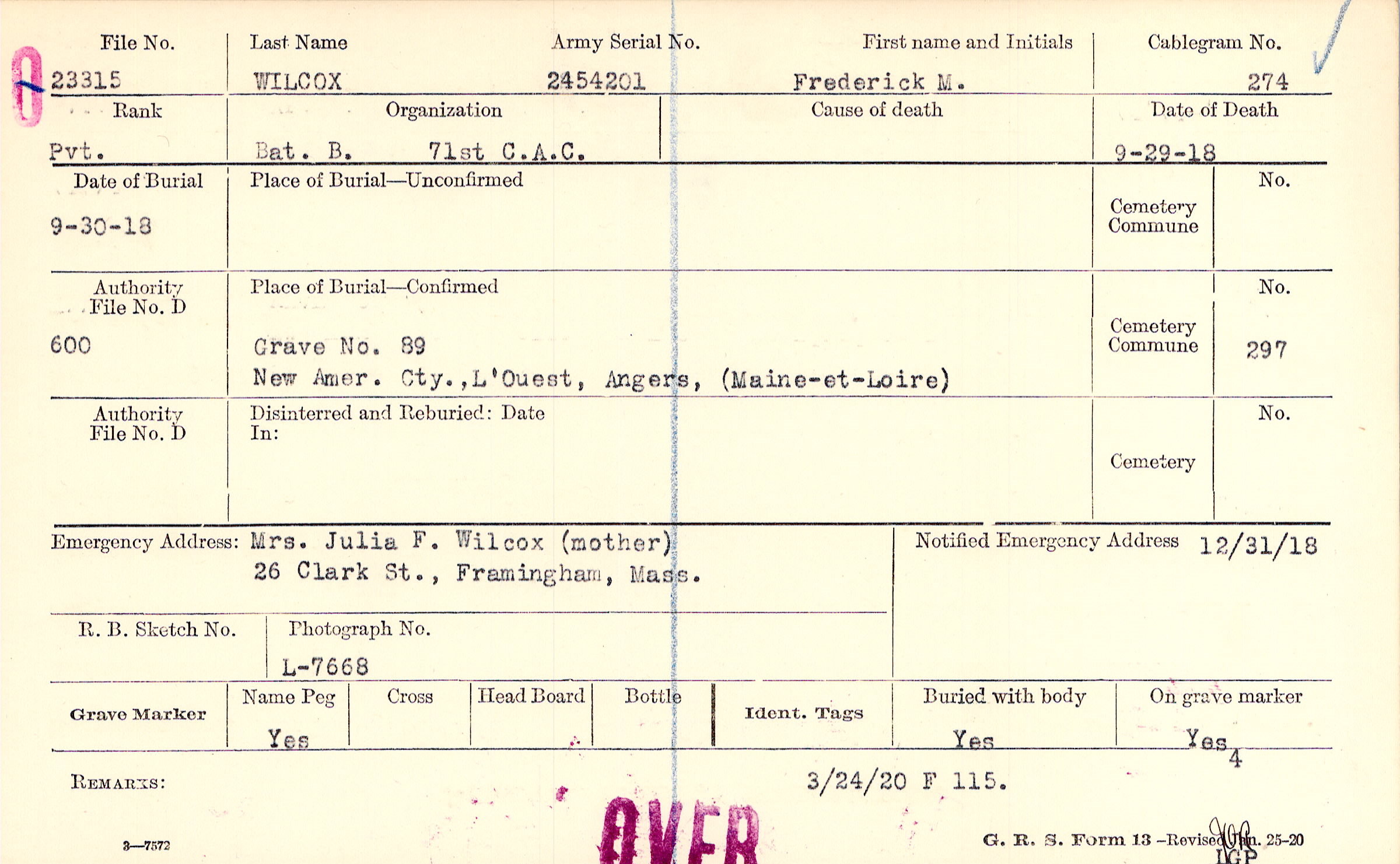 Mrs. Julia F. Wilcox (mother), 26 Clark St., Framingham, Mass.