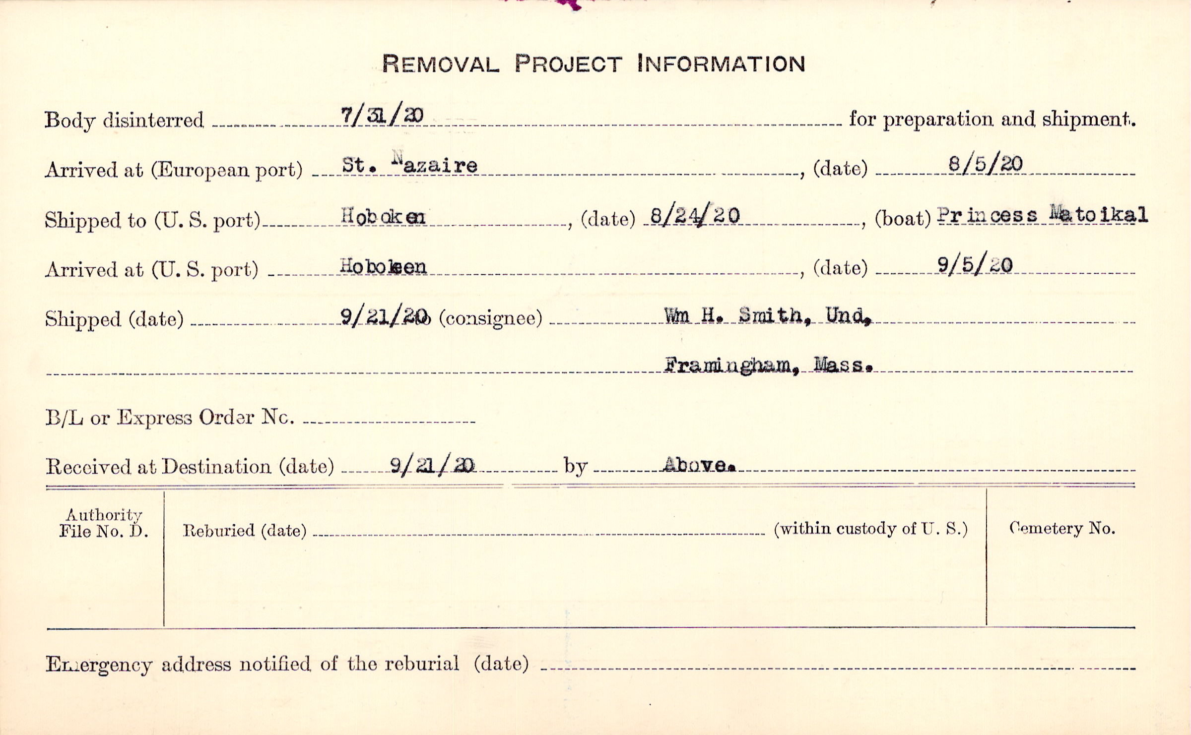 Body disinterred 7/31/1920 for preparation and shipment.