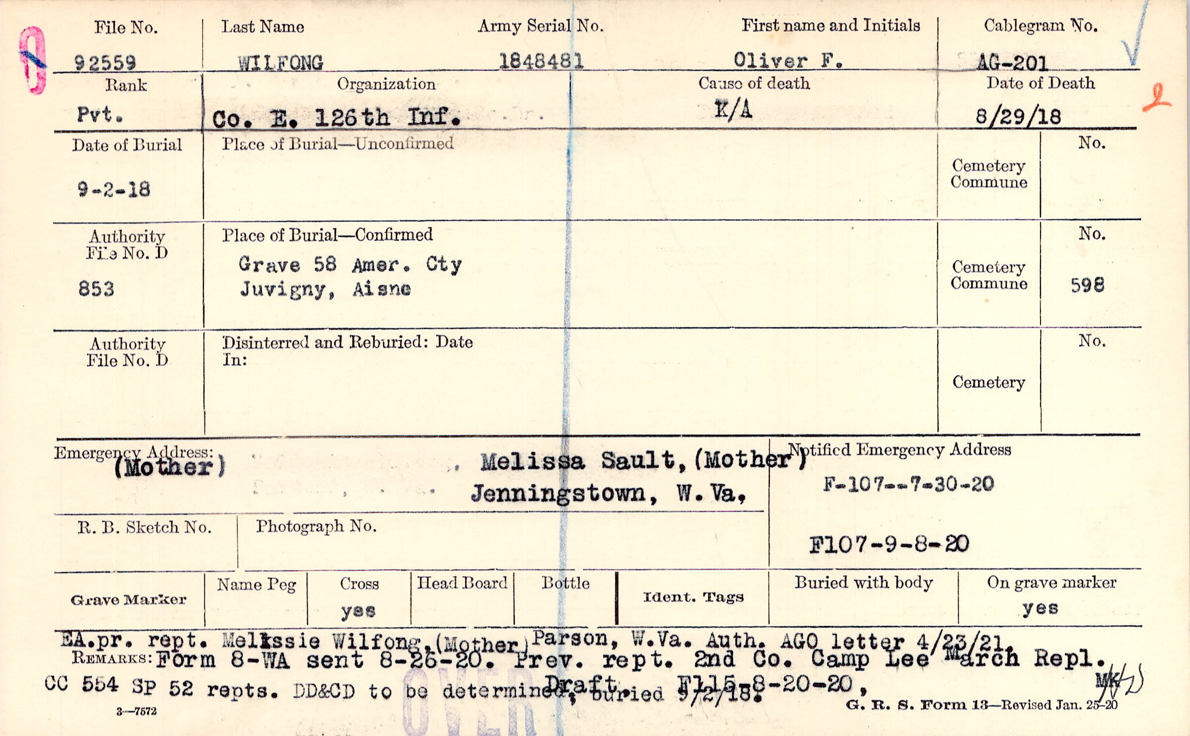 EA. pr. rept. Melissie Wilfong, (Mother), Parson, W.Va. Auth. AGO letter 4/23/21. Prev. rept. 2nd Co. Camp Lee March Repl. Draft. CC 554 SP 52 repts. DD&CD to be determined, buried 9/2/18, Form 8-WA sent 8-26-20., F115 - 8-20-20