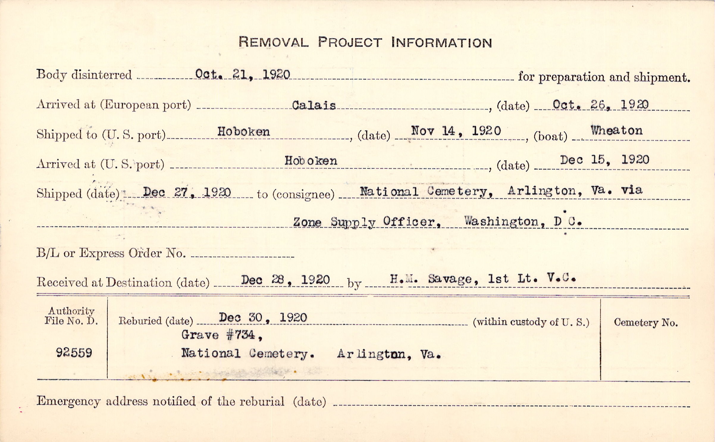 to National Cemetery, Arlington, Va. via Zone Supply Officer, Washington, D.C.