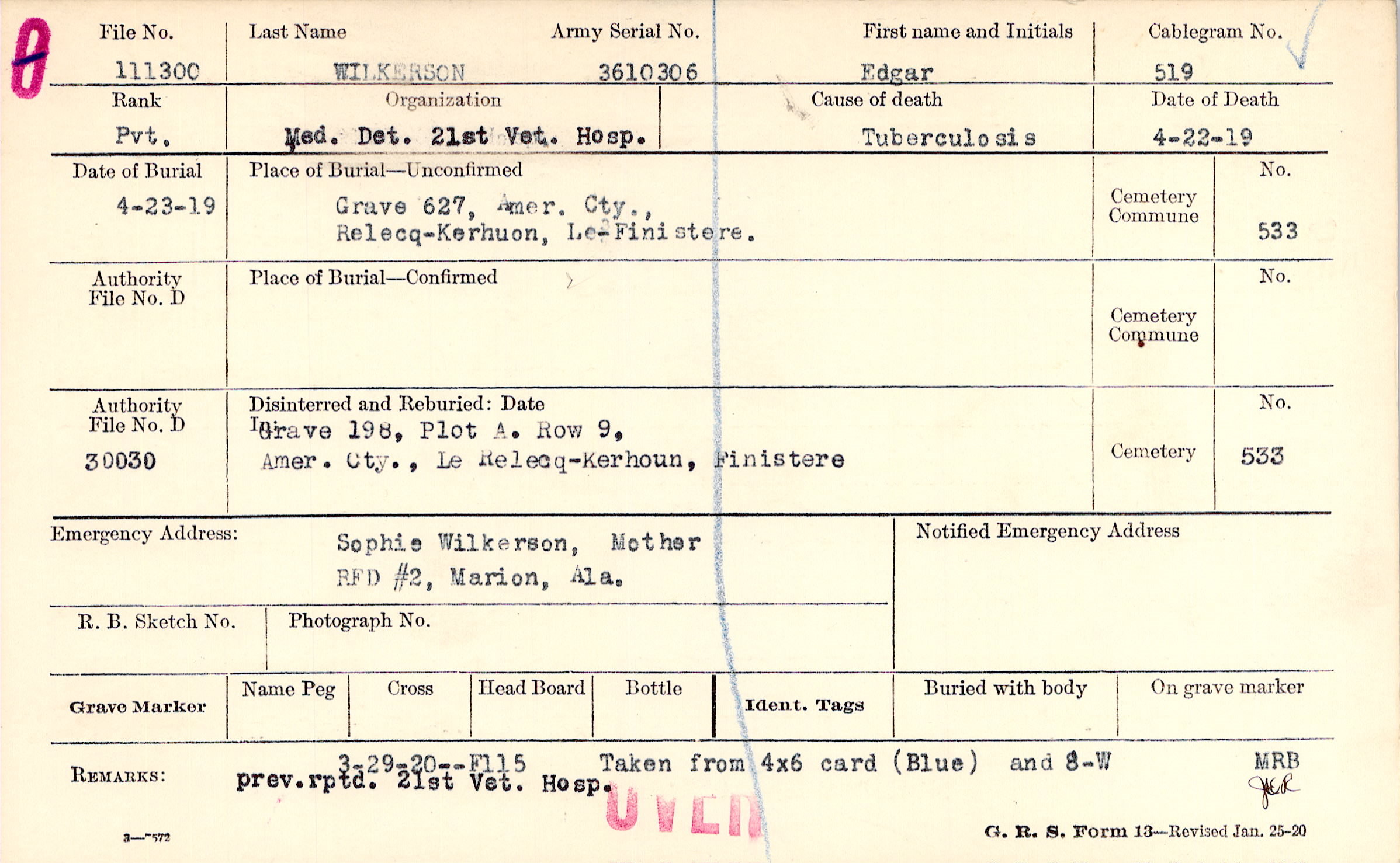 Taken from 4x6 card (Blue) and 8-W, prev.rptd. 21st Vet. Hosp.