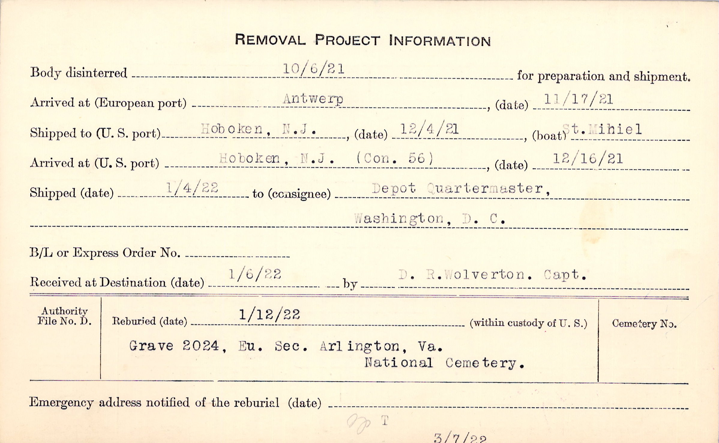 Body disinterred 10/6/1921 for preparation and shipment.