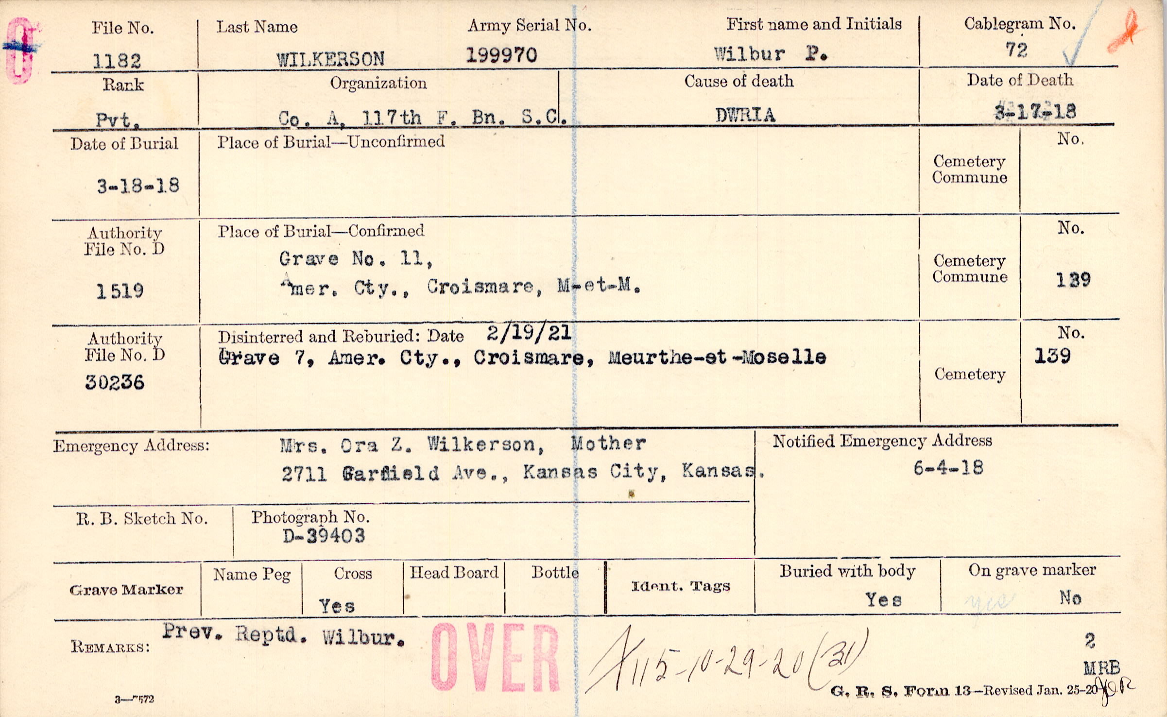 Mrs. Ora Z. Wilkerson, Mother, 2711 Garfield Ave., Kansas City, Kansas.