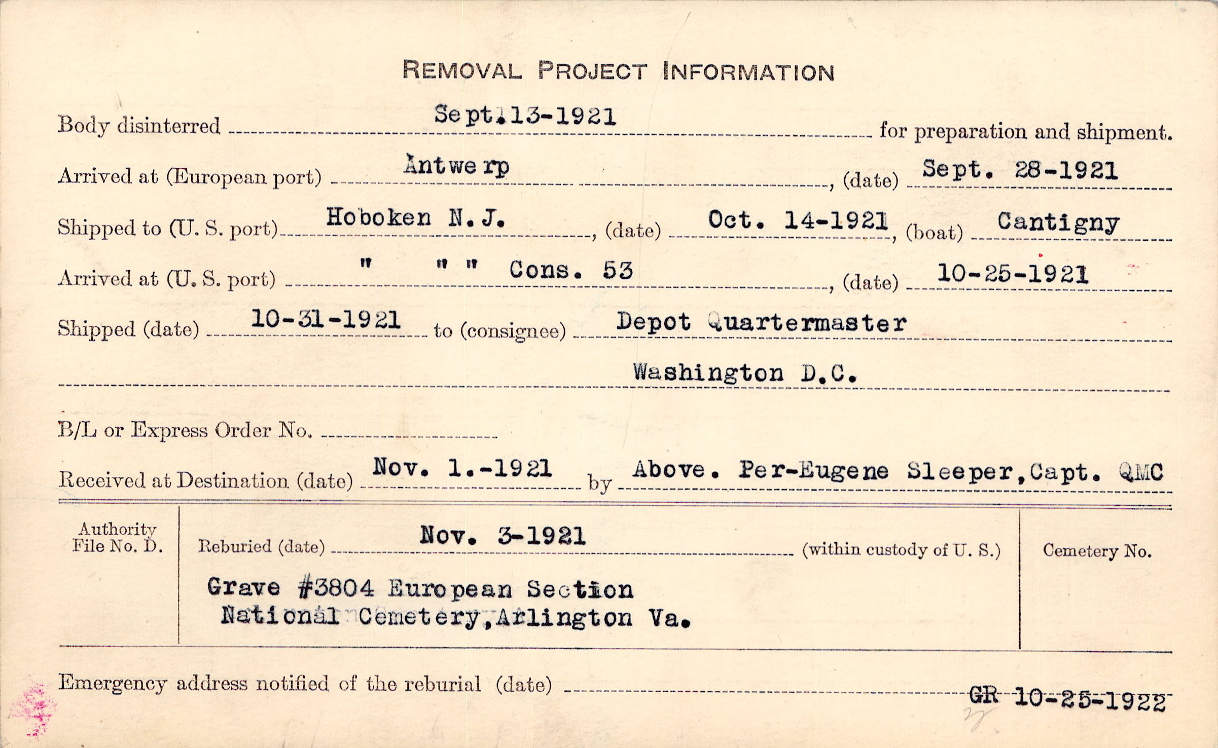 Body disinterred 9/13/1921 for preparation and shipment.