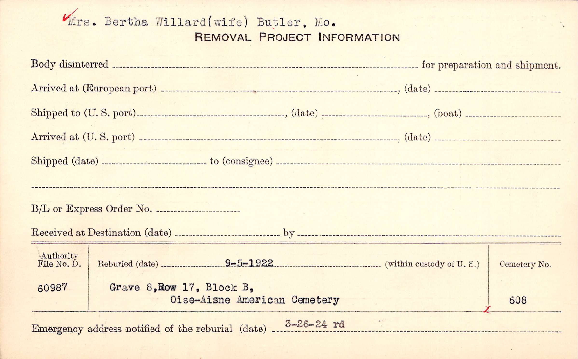 Mrs. Bertha Willard (wife) Butler, Mo. |