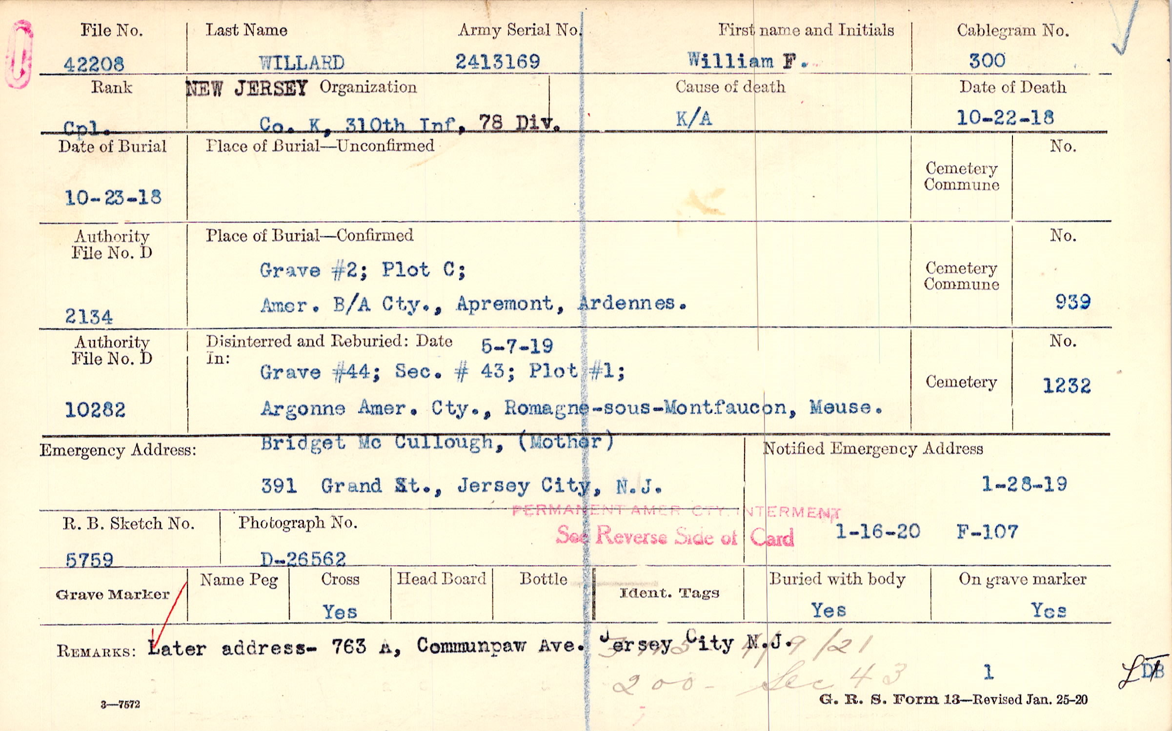 Bridget Mc Cullough, (Mother), 391 Grand St., Jersey City, N.J.