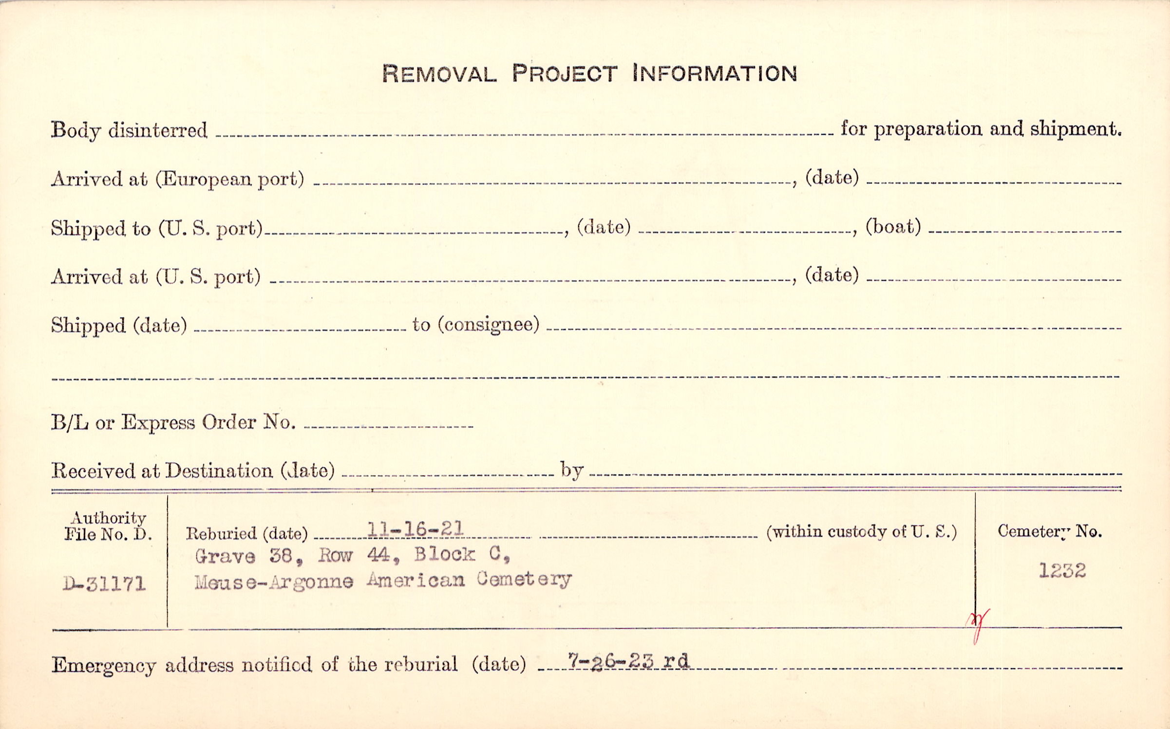Grave 44, Section 43, Plot 1, Argonne American Cemetery, Romagne-sous-Montfaucon, Meuse