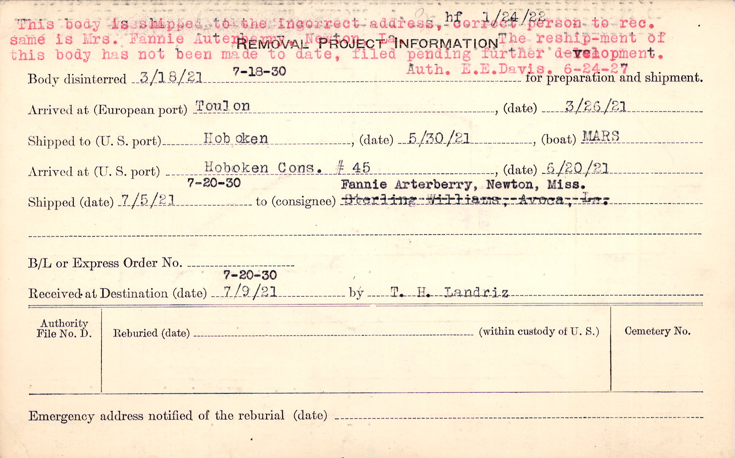 1/24/22 This body is shipped to the incorrect address, correct person to rec. same is Mrs. Fannie Auterberry, Newton La. The reship-ment of this body has not been made to date, filed pending further development. Auth. E.E. Davis. 6-24-27 |